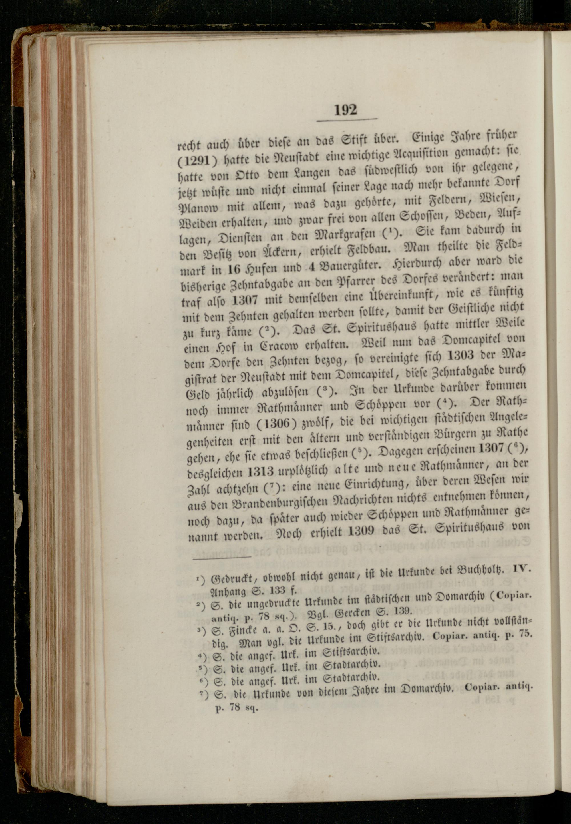 192 recht auch über dieſe an das Stift über. Einige Jahre früher (1291) hatte die Neuſtadt eine wichtige Acquiſition gemacht: ſie hatte von Otto dem Langen das ſudweſtlich von ihr gelegene, jetzt wuͤſte und nicht einmal ſeiner Lage nach mehr bekannte Dorf Planow mit allem, was dazu gehörte, mit Feldern, Wieſen, Weiden erhalten, und zwar frei von allen Schoſſen, Beden, Auflagen, Dienſten an den Markgrafen(I). Sie kam dadurch in den Beſitz von Ackern, erhielt Feldbau. Man theilte die Feldmark in 16 Hufen und 4 Bauerguͤter. Hierdurch aber ward die bisherige Zehntabgabe an den Pfarrer des Dorfes veraͤndert: man traf alſo 1307 mit demſelben eine Übereinkunft, wie es künftig mit dem Zehnten gehalten werden ſollte, damit der Geiſtliche nicht zu kurz kame(*). Das St. Spiritushaus hatte mittler Weile einen Hof in Cracow erhalten. Weil nun das Domcapitel von dem Dorfe den Zehnten bezog, ſo vereinigte ſich 1303 der Magiſtrat der Neuſtadt mit dem Domcapitel, dieſe 3 ehntabgabe durch Geld jährlich abzuloͤſen(). In der Urkunde darüber kommen noch immer Rathmaͤnner und Schoppen vor C6). Der Rathmänner find(1306) zwölf, die bei wichtigen ſtaͤdtiſchen Angelegenheiten erſt mit den Altern und verſtaͤndigen Bürgern zu Rathe gehen, ehe fie etwas beſchließen(). Dagegen erſcheinen 1307(5), desgleichen 1313 urploͤtzlich alte und neue Rathmaͤnner, an der Zahl achtzehn(7): eine neue Einrichtung, über deren Weſen wir