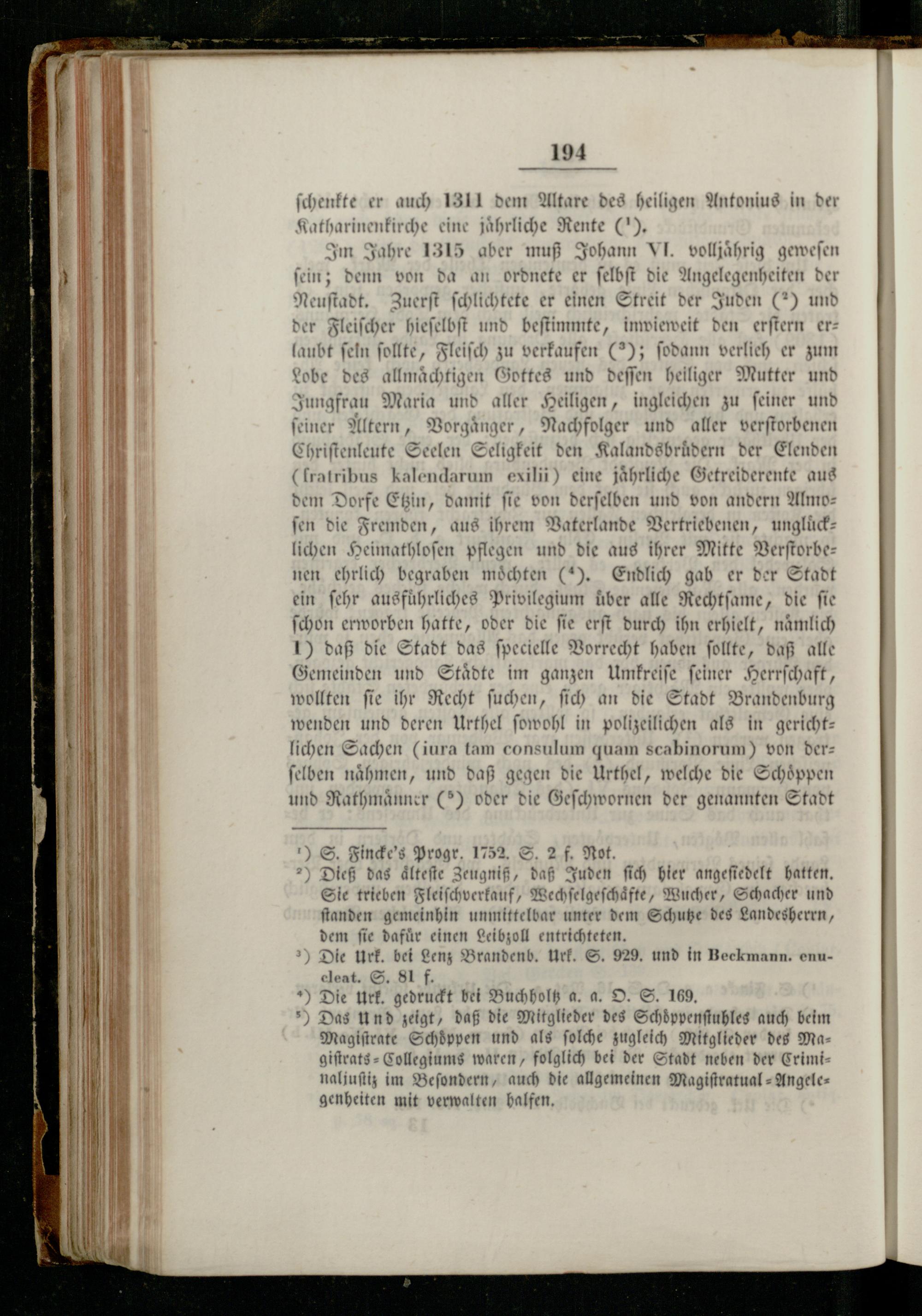 Im Jahre 1315 aber muß Johann VI. volljährig geweſen ſein; denn von da an ordnete er ſelbſt die Angelegenheiten der Neuſtadt. Zuerſt ſchlichtete er einen Streit der Juden(2) und der Fleiſcher hieſelbſt und beſtimmte, inwieweit den erſtern erlaubt ſeln ſollte, Fleiſch zu verkaufen(2); ſodann verlieh er zum Lobe des allmächtigen Gottes und deſſen heiliger Mutter und Jungfrau Maria und aller Heiligen, ingleichen zu ſeiner und feiner Altern, Vorgaͤnger, Nachfolger und aller verſtorbenen Chriſtenleute Seelen Seligkeit den Kalandsbrüͤdern der Elenden (lratribus kalendarum exilij) eine jährliche Getreiderente aus dem Dorfe Etzin, damit ſie von derſelben und von andern Almofen die Fremden, aus ihrem Vaterlande Vertriebenen, unglücklichen Heimathloſen pflegen und die aus ihrer Mitte fern nen ehrlich begraben möchten(„). Endlich gab er der Stadt ein ſehr ausführliches Privilegium über alle 1 die ſie ſchon erworben hatte, oder die fie erſt durch ihn erhielt, nämlich 1) daß die Stadt das ſpecielle Vorrecht haben ſollte, daß alle Gemeinden und Staͤdte im ganzen Umkreiſe ſeiner Herrſchaft, wollten ſie ihr Recht ſuchen, ſich an die Stadt Brandenburg wenden und deren Urthel ſowohl in polizeilichen als in gerichtlichen Sachen(iura tam consulum quam scabinorum) von der: ſelben naͤhmen, und daß gegen die Urthel, welche die Schoͤppen und Rathmaͤnner(5) oder die Geſchwornen der genannten Stadt