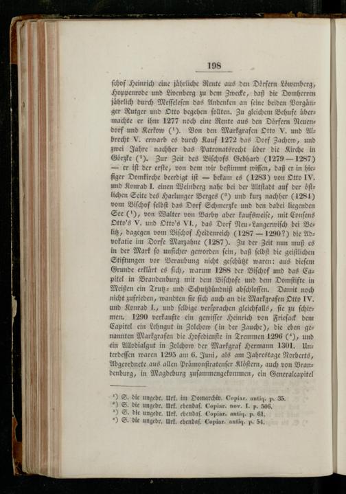 Rutger und Otto begehen ſollten. Zu gleichem Behufe übermachte er ihm 1277 noch eine Rente aus den Dörfern Neuen: dorf und Kerkow(1). Von den Markgrafen Otto V. und Al—brecht V. erwarb es durch Kauf 1272 das Dorf Zachow, und zwei Jahre nachher das Patronatsrecht über die Kirche in Goͤrzke(2). Zur Zeit des Biſchofs Gebhard(1279— 1287) — er iſt der erſte, von dem wir beſtimmt wiſſen, daß er in hieſiger Domkirche beerdigt iſt— bekam es(1283) von Otto IV. und Konrad J. einen Weinberg nahe bei der Altſtadt auf der oͤſtlichen Seite des Harlunger Berges(2) und kurz nachher(1281) vom Biſchof ſelbſt das Dorf Schmerzke und den dabei liegenden See(1), von Walter von Barby aber kaufsweiſe, mit Conſens Otto's V. und Otto's VI., das Dorf Neu-Langerwiſch bei Bez litz, dagegen vom Biſchof Helbenr eich(1287— 1290?) die Advokatie im Dorfe Marzahne(1287). Zu der Seit nun muß es in der Mark ſo unſicher geworden ſein, daß ſelbſt e geiſtlichen Stiftungen vor Beraubung nicht geſchuͤtzt waren: aus dieſem 2 erklaͤrt es ſich, warum 1288 der Biſchof und das Ca: pitel in Brandenburg mit dem Biſchofe und dem Domſtifte in reißen ein Trutz und Schutzbuͤndniß abſchloſſen. Damit noch nicht zufrieden, wandten ſie ſich auch an die Markgrafen Otto IV. und Konrad J., und ſelbige verſprachen gleichfalls, fie zu ſchir— men. 1290 verkaufte ein gewiſſer Heinrich von Frieſack dem Capitel ein Lehngut in Zolchow(in der Zauche), die eben ge— nannten Markgrafen die Hofedienſte in Tremmen 1296(), und ein Allodialgut in Zolchow der Markgraf Hermann 1301. Un: terdeſſen waren 1295 am 6. Juni, als am Jahrestage Norberts, Abgeordnete aus allen Praͤmonſtratenſer Kloͤſtern, auch von Bran— denburg, in Magdeburg zuſammengekommen, ein Generalcapitel