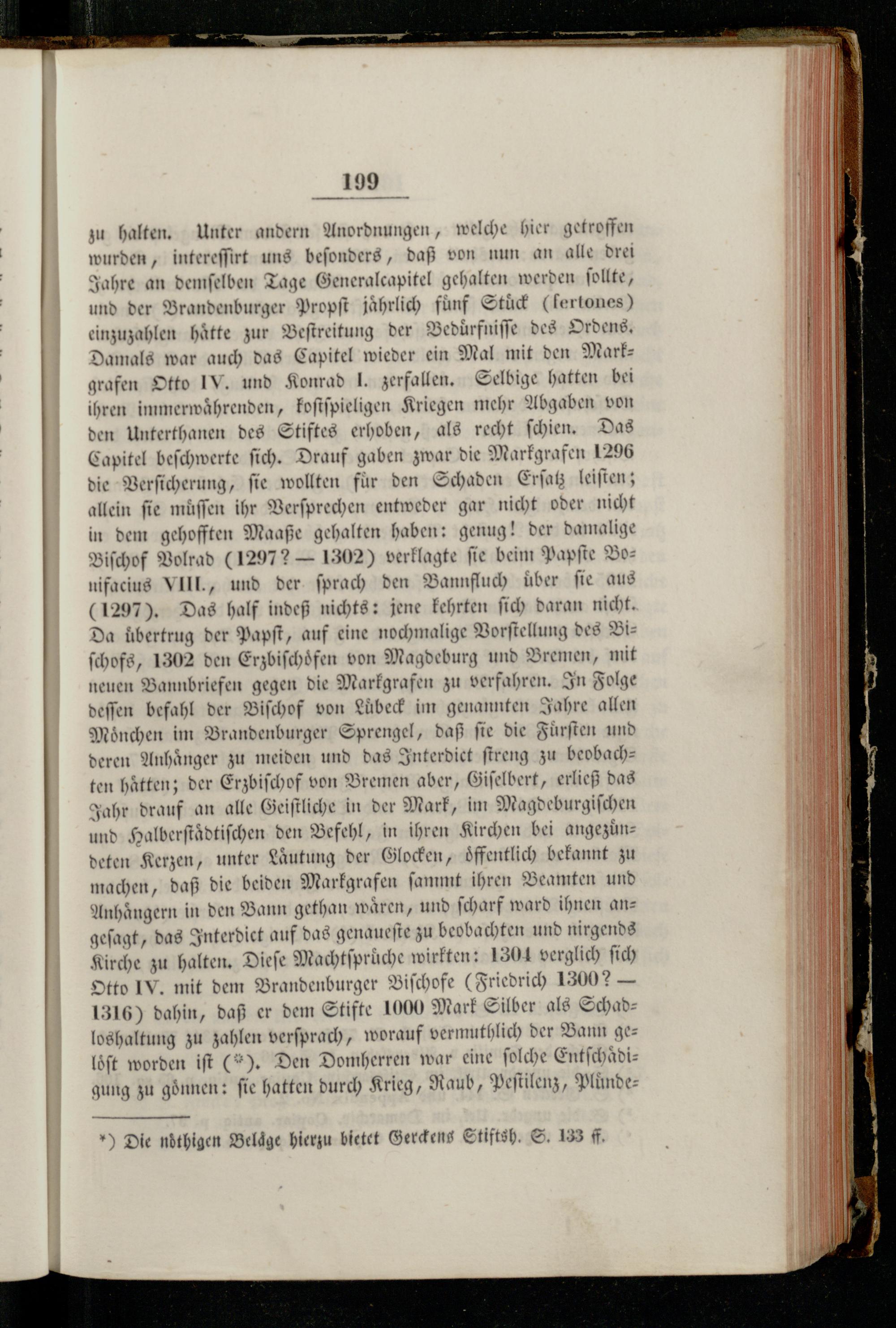 zu halten. Unter andern Anordnungen, welche hier getroffen wurden, intereſſirt uns beſonders, daß von nun an alle drei Jahre an demſelben Tage Generalcapitel gehalten werden ſollte, und der Brandenburger Propſt jährlich funf Stuͤck(ſertones) einzuzahlen hätte zur Beſtreitung der Bedurfniſſe des Ordens. Damals war auch das Capitel wieder ein Mal mit den Markgrafen Otto IV. und Konrad 1. zerfallen. Selbige hatten bei ihren immerwaͤhrenden, koſtſpieligen Kriegen mehr Abgaben von den Unterthanen des Stiftes erhoben, als recht ſchien. Das Capitel beſchwerte ſich. Drauf gaben zwar die Markgrafen 1296 die Verſicherung, ſie wollten fuͤr den Schaden Erſatz leiſten; allein fie muͤſſen ihr Verſprechen entweder gar nicht oder nicht in dem gehofften Maaße gehalten haben: genug! der damalige Biſchof Volrad(12977— 1302) verklagte ſie beim Papſte Bonifacius VIII., und der ſprach den Bannfluch über fie aus (1297). Das half indeß nichts: jene kehrten ſich daran nicht. Da übertrug der Papſt, auf eine nochmalige Vorſtellung des Biſchofs, 1302 den Erzbiſchoͤfen von Magdeburg und Bremen, mit neuen Bannbriefen gegen die Markgrafen zu verfahren. In Folge deſſen befahl der Biſchof von Lubeck im genannten Jahre allen Moͤnchen im Brandenburger Sprengel, daß ſie die Fuͤrſten und deren Anhänger zu meiden und das Interdiet ſtreng zu beobachten haͤtten; der Erzbiſchof von Bremen aber, Giſelbert, erließ das Jahr drauf an alle Geiſtliche in der Mark, im Magdeburgiſchen und Halberſtaͤdtiſchen den Befehl, in ihren Kirchen bei angezuͤndeten Kerzen, unter Laͤutung der Glocken, oͤffentlich bekannt zu machen, daß die beiden Markgrafen ſammt ihren Beamten und Anhaͤngern in den Bann gethan waͤren, und ſcharf ward ihnen angeſagt, das Interdiet auf das genaueſte zu beobachten und nirgends Kirche zu halten. Dieſe Machtſprüche wirkten: 1304 verglich ſich Otto IV. mit dem Brandenburger Biſchofe(Friedrich 13007?— 1316) dahin, daß er dem Stifte 1000 Mark Silber als Schadloshaltung zu zahlen verſprach, worauf vermuthlich der Bann geloͤſt worden iſt(*). Den Domherren war eine ſolche Entſchaͤdigung zu gönnen: ſie hatten durch Krieg, Raub, Peſtilenz, Pluͤnde
