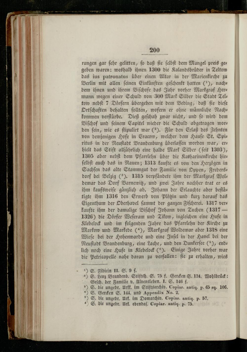 rungen gar ſehr gelitten, fo daß fie ſelbſt dem Mangel preis ges geben waren: weshalb ihnen 1300 die Kalandsbrüder in Teltow das ius patronatus über einen Altar in der Marienkirche zu Berlin mit allen feinen Einkünften geſchenkt hatten(), nachdem ihnen und ihrem Biſchofe das Jahr vorher Markgraf Herz mann wegen einer Schuld von 300 Mark Silber die Stadt Teltow nebſt 7 Dörfern übergeben mit dem Beding, daß fie dieſe Ortſchaften behalten ſollten, wofern er ohne maͤnnliche Nachkommen verſtuͤrbe. Dieß geſchah zwar nicht, und fo wird dem Biſchof und feinem Capitel wieder die Schuld abgetragen worden fein, wie es ſtipulirt war(2). Für den Erlaß des Zehnten von demjenigen Hofe in Cracow, welcher dem Hauſe St. Spiritus in der Neuſtadt Brandenburg uͤberlaſſen worden war, erhielt das Stift alljaͤhrlich eine halbe Mark Silber(ſeit 1303), 1305 aber nebſt dem Pfarrlehn über die Katharinenkirche hieſelbſt auch das in Nauen; 1313 kaufte es von den Herzögen in Sachſen das alte Stammgut der Familie von Oppen, Fredersdorf bei Belzig(2). 1315 verpfaͤndete ihm der Markgraf Woldemar das Dorf Barnewitz, und zwei Jahre nachher trat er es ihm kaufsweiſe gänzlich ab. Johann der Erlauchte aber beſtaͤtigte ihm 1316 den Erwerb von Ploͤtzin und kurz darauf das Eigenthum der Oberhavel ſammt der ganzen Fiſcherei. 1317 verkaufte ihm der damalige Biſchof Johann von Tuchen(1317— 1326) die Doͤrfer Weſeram und Tikow, ingleichen eine Hufe in Klebelock und im folgenden Jahre das Pfarrlehn der Kirche zu Markow und Markede(*), Markgraf Woldemar aber 1318 eine Wieſe bei der Hohenwarde und eine Inſel in der Havel bei der Neuſtadt Brandenburg, eine Lache, und den Dunkerſee(5), end lich noch eine Hufe in Klebelock(5). Einige Jahre vorher war die Petricapelle nahe daran zu verfallen: ſie zu erhalten, wies