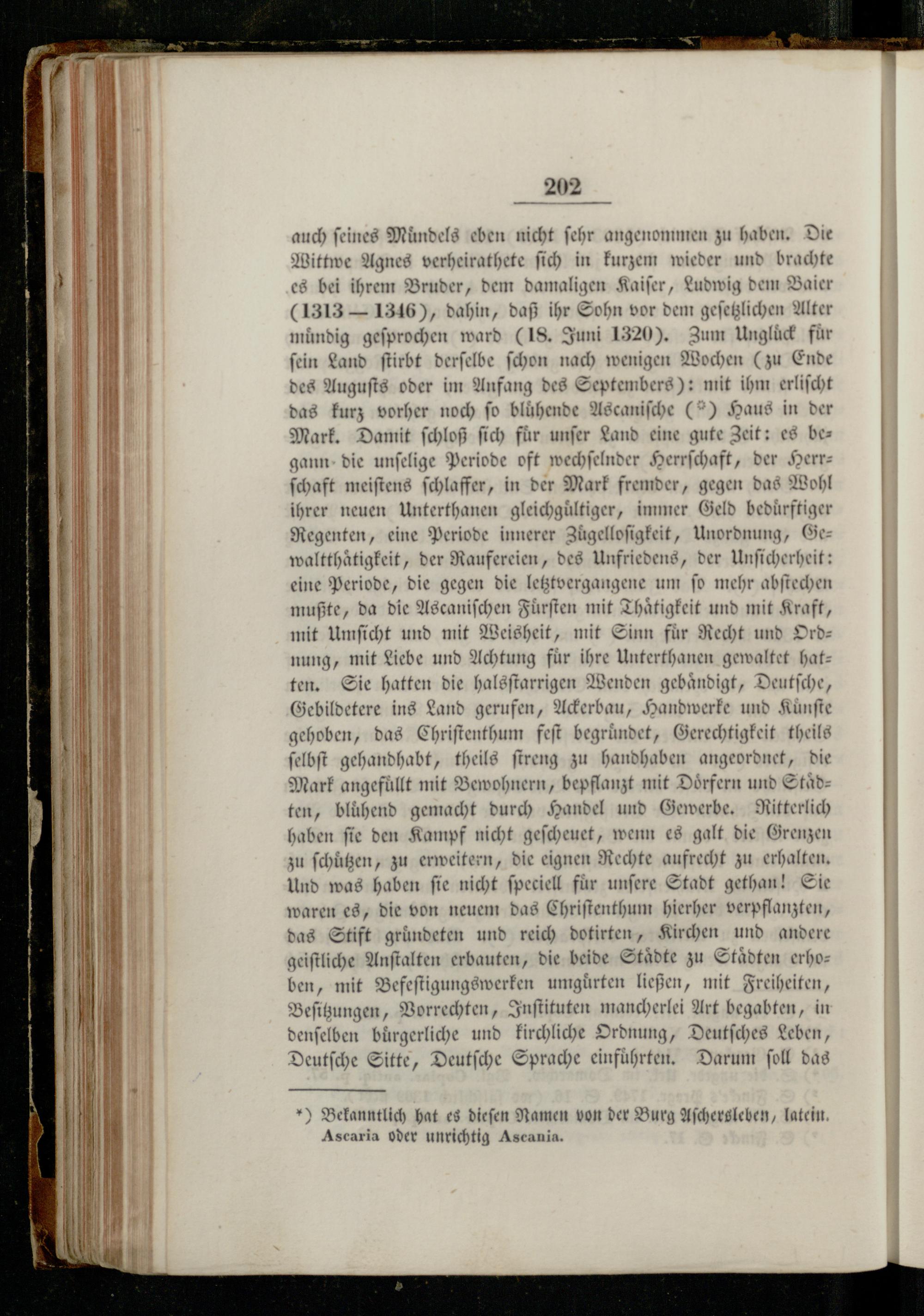 Wittwe Agnes verheirathete ſich in kurzem wieder und brachte es bei ihrem Bruder, dem damaligen Kaiſer, Ludwig dem Baier (1313— 1316), dahin, daß ihr Sohn vor dem geſetzlichen Alter mundig geſprochen ward(18. Juni 1320). Zum Unglück für ſein Land ſtirbt derſelbe ſchon nach wenigen Wochen(zu Ende des Auguſts oder im Anfang des Septembers): mit ihm erliſcht das kurz vorher noch fo blühende Ascaniſche(2) Haus in der Mark. Damit ſchloß ſich für unſer Land eine gute Zeit: es bes gann die unſelige Periode oft wechſelnder Herrſchaft, der Herrſchaft meiſtens ſchlaffer, in der Mark fremder, gegen das Wohl ihrer neuen Unterthanen gleichgültiger, immer Geld beduͤrftiger Regenten, eine Periode innerer Zuügelloſigkeit, Unordnung, Gewaltthaͤtigkeit, der Raufereien, des Unfriedens, der Unſicherheit: eine Periode, die gegen die letztvergangene um ſo mehr abſtechen mußte, da die Ascaniſchen Fuͤrſten mit Thaͤtigkeit und mit Kraft, mit Umſicht und mit Weisheit, mit Sinn fuͤr Recht und Ordnung, mit Liebe und Achtung fuͤr ihre Unterthanen gewaltet hatten. Sie hatten die halsſtarrigen Wenden gebaͤndigt, Deutſche, Gebildetere ins Land gerufen, Ackerbau, Handwerke und Kuͤnſte gehoben, das Chriſtenthum feſt begründet, Gerechtigkeit theils ſelbſt gehandhabt, theils ſtreng zu handhaben angeordnet, die Mark angefuͤllt mit Bewohnern, bepflanzt mit Dörfern und Staͤdten, bluͤhend gemacht durch Handel und Gewerbe. Ritterlich haben ſie den Kampf nicht geſcheuet, wenn es galt die Grenzen zu ſchuͤtzen, zu erweitern, die eignen Rechte aufrecht zu erhalten. Und was haben fie nicht ſpeciell für unſere Stadt gethan! Sie waren es, die von neuem das Chriſtenthum hierher verpflanzten, das Stift gründeten und reich dotirten, Kirchen und andere geiſtliche Anſtalten erbauten, die beide Städte zu Städten erhoben, mit Befeſtigungswerken umguͤrten ließen, mit Freiheiten, Beſitzungen, Vorrechten, Inſtituten mancherlei Art begabten, in denſelben bürgerliche und kirchliche Ordnung, Deutſches Leben, Deutſche Sitte, Deutſche Sprache einfüͤhrten. Darum ſoll das