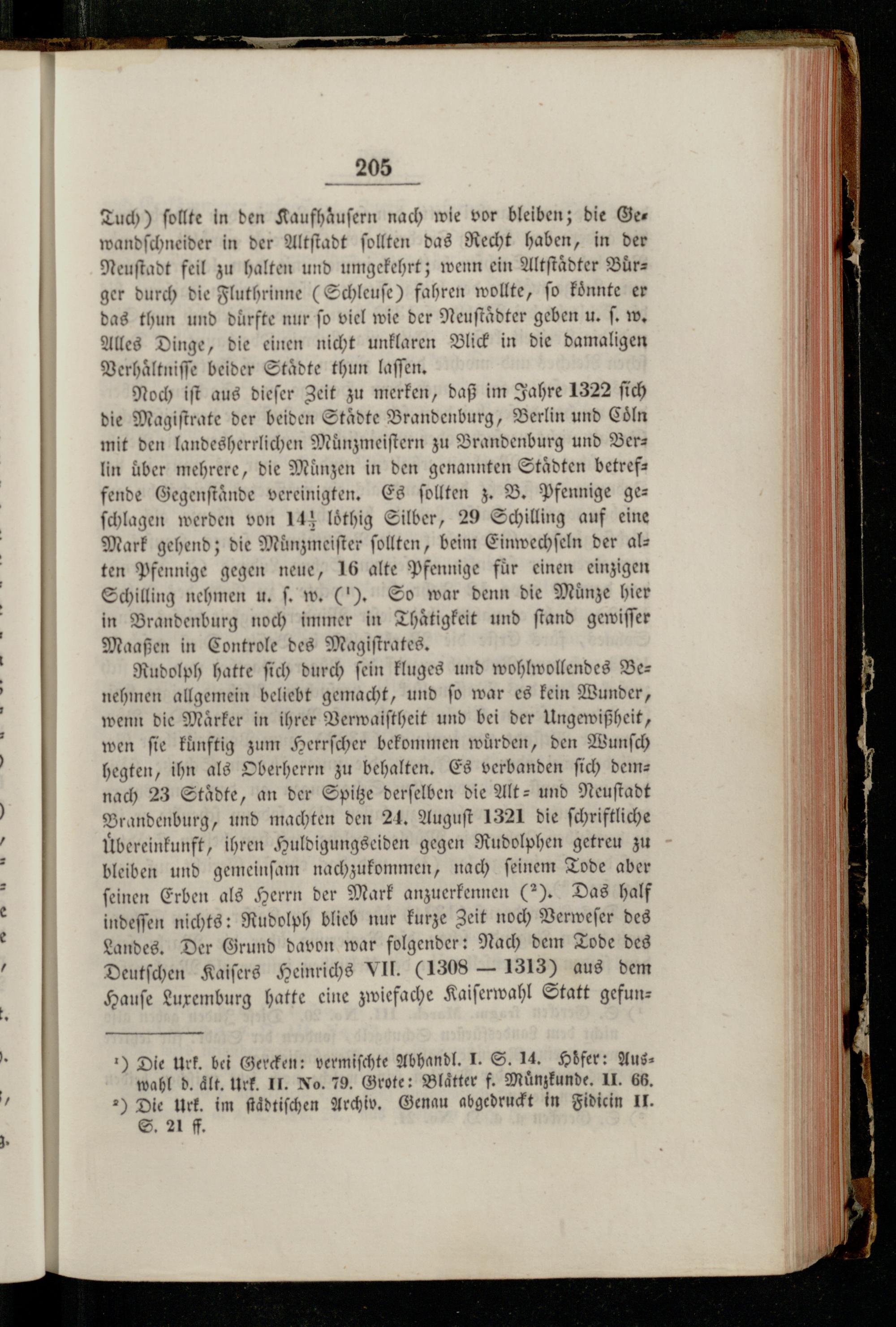 Rudolph hatte ſich durch fein kluges und wohlwollendes Bes nehmen allgemein beliebt gemacht, und ſo war es kein Wunder, wenn die Maͤrker in ihrer Verwaiſtheit und bei der Ungewißheit, wen fie kuͤnftig zum Herrſcher bekommen würden, den Wunſch hegten, ihn als Oberherrn zu behalten. Es verbanden ſich demnach 23 Staͤdte, an der Spitze derſelben die Alt- und Neuſtadt Brandenburg, und machten den 24, Auguſt 1321 die ſchriftliche uͤbereinkunft, ihren Huldigungseiden gegen Rudolphen getreu zu bleiben und gemeinſam nachzukommen, nach ſeinem Tode aber feinen Erben als Herrn der Mark anzuerkennen(2). Das half indeſſen nichts: Rudolph blieb nur kurze Zeit noch Verweſer des Landes. Der Grund davon war folgender: Nach dem Tode des Deutſchen Kaiſers Heinrichs VII.(1308— 1313) aus dem Hauſe Luxemburg hatte eine zwiefache Kaiſerwahl Statt gefun