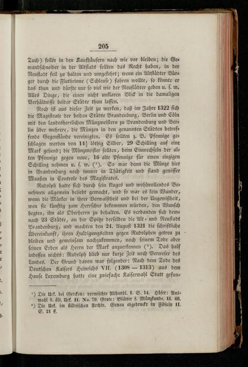 Noch iſt aus dieſer Zeit zu merken, daß im Jahre 1322 ſich die Magiſtrate der beiden Staͤdte Brandenburg, Berlin und Coͤln mit den landesherrlichen Muͤnzmeiſtern zu Brandenburg und Berlin über mehrere, die Münzen in den r, Staͤdten betreffende Gegenſtaͤnde vereinigten. Es ſollten z. B. Pfennige ge= ſchlagen werden von 141 loͤthig Silber, 29 Schilling auf eine Mark gehend; die Munzmeiſter ſollten, beim Einwechſeln der alten Pfennige gegen neue, 16 alte Pfennige für einen einzigen Schilling nehmen u. ſ. w.(I). So war denn die Münze hier in Brandenburg noch immer in Thaͤtigkeit und ſtand gewiſſer Maaßen in Controle des Magiſtrates.