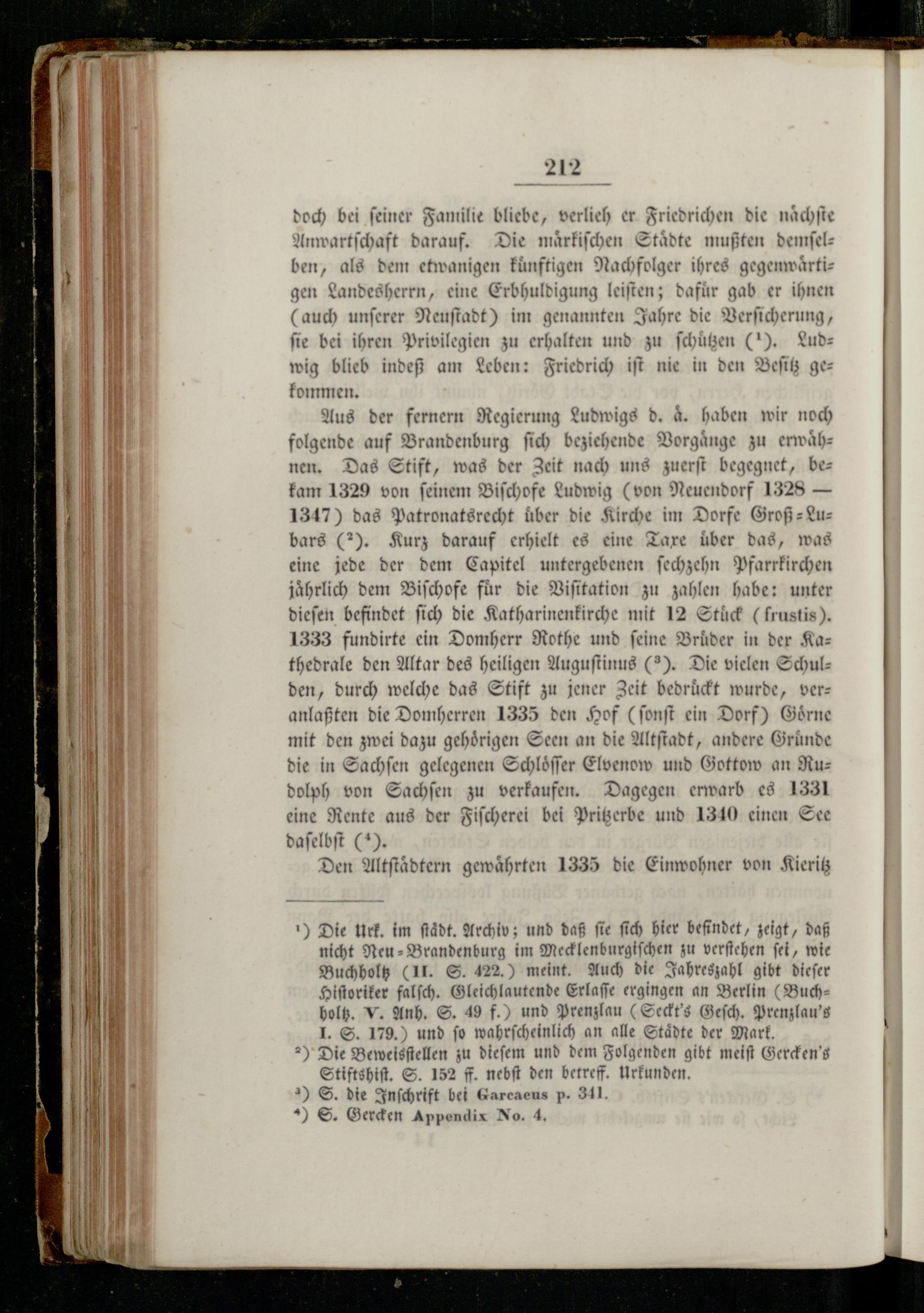 Aus der fernern Regierung Ludwigs d. a. haben wir noch folgende auf Brandenburg ſich beziehende Vorgänge zu erwaͤhnen. Das Stift, was der Zeit nach uns zuerſt begegnet, bekam 1329 von ſeinem Biſchofe Ludwig(von Neuendorf 1328— 1347) das Patronatsrecht über die Kirche im Dorfe Groß-⸗Lubars(2). Kurz darauf erhielt es eine Taxe über das, was eine jede der dem Capitel untergebenen ſechzehn Pfarrkirchen jaͤhrlich dem Biſchofe fuͤr die Viſitation zu zahlen habe: unter dieſen befindet ſich die Katharinenkirche mit 12 Stuͤck(frustis). 1333 fundirte ein Domherr Rothe und feine Bruͤder in der Ka—thedrale den Altar des heiligen Auguſtinus(2). Die vielen Schulden, durch welche das Stift zu jener Zeit bedruͤckt wurde, veranlaßten die Domherren 1335 den Hof(ſonſt ein Dorf) Goͤrne mit den zwei dazu gehörigen Seen an die Altſtadt, andere Grunde die in Sachſen gelegenen Schloͤſſer Elvenow und Gottow an Ru— dolph von Sachſen zu verkaufen. Dagegen erwarb es 1331 eine Rente aus der Fiſcherei bei Pritzerbe und 1340 einen See