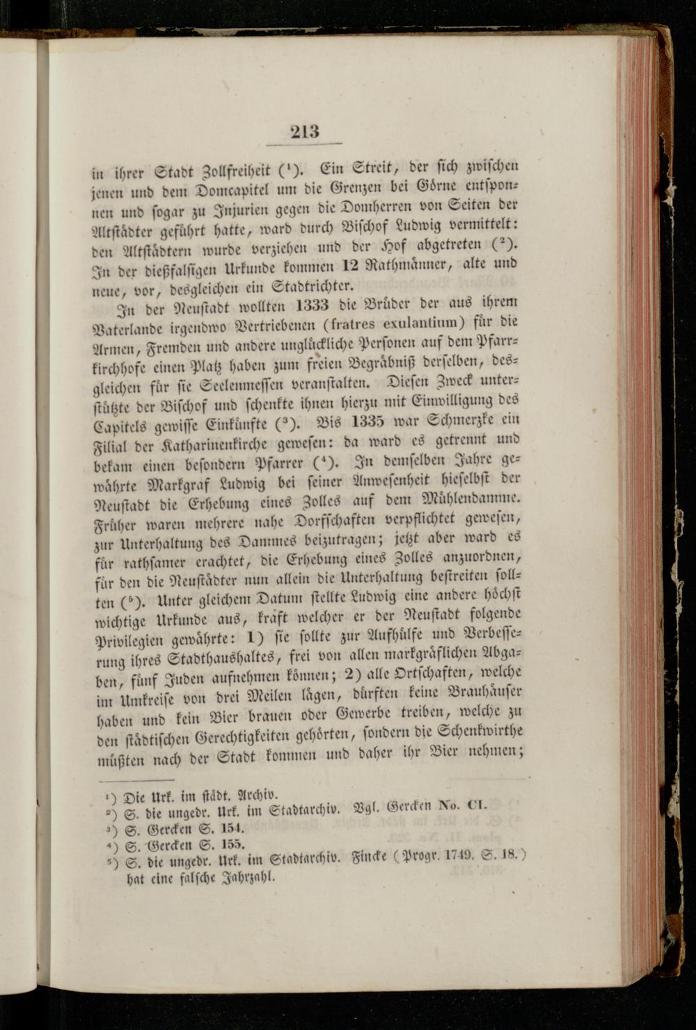 in ihrer Stadt Zollfreiheit(). Ein Streit, der ſich zwiſchen jenen und dem Domcapitel um die Grenzen bei Goͤrne entſponnen und ſogar zu Injurien gegen die Domherren von Seiten der Altſtaͤdter geführt hatte, ward durch Biſchof Ludwig vermittelt: den Altſtäͤdtern wurde verziehen und der Hof abgetreten(2). In der dießfalſigen Urkunde kommen 12 Rathmaͤnner, alte und neue, vor, desgleichen ein Stadtrichter.
