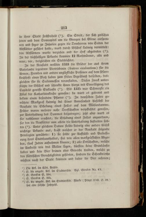 In der Neuſtadt wollten 1333 die Bruͤder der aus ihrem Vaterlande irgendwo Vertriebenen(fratres exulantium) für die Armen, Fremden und andere ungluͤckliche Perſonen auf dem Pfarrkirchhofe einen Platz haben zum freien Begraͤbniß derſelben, des: gleichen für fie Seelenmeſſen veranſtalten. Dieſen Zweck unterſtutzte der Biſchof und ſchenkte ihnen hierzu mit Einwilligung des Capitels gewiſſe Einkünfte(3). Bis 1335 war Schmerzke ein Filial der Katharinenkirche geweſen: da ward es getrennt und bekam einen beſondern Pfarrer(). In demſelben Jahre ge— währte Markgraf Ludwig bei ſeiner Anweſenheit hieſelbſt der Neuſtadt die Erhebung eines Zolles auf dem Muͤhlendamme. Früher waren mehrere nahe Dorfſchaften verpflichtet geweſen, zur Unterhaltung des Dammes beizutragen; jetzt aber ward es für rathſamer erachtet, die Erhebung eines Zolles anzuordnen, für den die Neuſtadter nun allein die Unterhaltung beſtreiten ſollten(). Unter gleichem Datum ſtellte Ludwig eine andere hoͤchſt wichtige Urkunde aus, kraft welcher er der Neuſtadt folgende Privilegien gewaͤhrte: 1) fie ſollte zur Aufhuͤlfe und Verbeſſerung ihres Stadthaushaltes, frei von allen markgraͤflichen Abgaben, fuͤnf Juden aufnehmen konnen; 2) alle Ortſchaften, welche im Umkreiſe von drei Meilen laͤgen, duͤrften keine Brauhaͤuſer haben und kein Bier brauen oder Gewerbe treiben, welche zu den ſtaͤdtiſchen Gerechtigkeiten gehoͤrten, ſondern die Schenkwirthe müßten nach der Stadt kommen und daher ihr Bier nehmen;