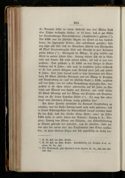 3) Niemand ſollte in einem Umkreiſe von drei Meilen Tuch oder Tücher verkaufen durfen, es ſei denn, daß er zur Gulde der Brandenburger Gewandſchneider(Tuchhaͤndler) gehörte(9. Bis 1338 war die jährliche Abgabe der Stadt an den Landesherrn, die ſogenannte Urbede, ſehr unbeſtimmt geweſen: Lud wig ſetzte alſo feſt, daß die Einwohner jährlich dem Markgrafen 40 Mark Brandenburgiſch Geld und Gewicht in zwei Terminen zahlen ſollten(2). Anlangend die Münze, fo ging dieſelbe jetzt oͤfters in andere Hände über. Ludwig befand ſich oft in Geld— noth und konnte ſich nicht anders helfen, als daß er jene ver— pachtete. Das geſchahe z. B. 1333 an drei Bürger in Bran— denburg auf 6 Jahre, und noch in demſelben Jahre verſprach er fie drei andern Buͤrgern nach Verlauf jener Zeit auf andere 6 Jahre. Das Jahr darauf weiſt er dem Herrmann von Arne— burg 13 Pfund jährliche Revenuen aus der Münze in Prenzlau und Brandenburg an(auf die jährliche Pacht); 1336, nachdem. erſt drei Jahre von der erſten Verpachtung abgelaufen find, verpachtet er fie ſchon wieder anderweitig auf 12 Jahre an Ru— dolph und Marcell von Luchin aus Stendal, und weiſt wieder 13 Pfund Pfennige aus der Münze von Prenzlau und Branden— burg an für feinen Capellan Sifrid(2). Da mag ihm allerdings vom jaͤhrlichen Ertrage wenig geblieben ſein!