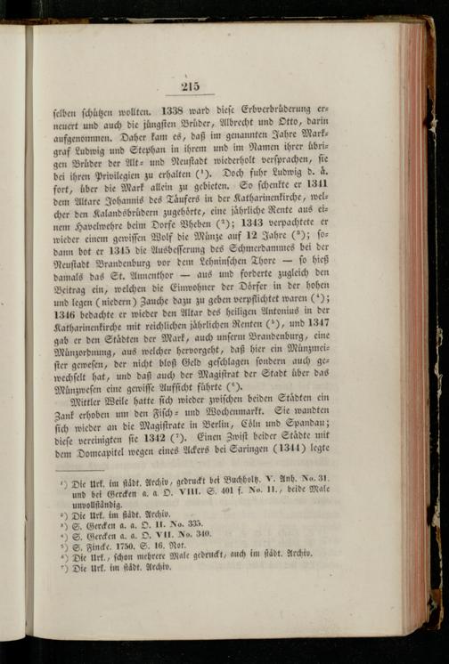 ſelben ſchützen wollten. 1338 ward dieſe Erbverbruͤderung erneuert und auch die juͤngſten Brüder, Albrecht und Otto, darin aufgenommen. Daher kam es, daß im genannten Jahre Markgraf Ludwig und Stephan in ihrem und im Namen ihrer uͤbrigen Brüder der Alt- und Neuſtadt wiederholt verſprachen, ſie bei ihren Privilegien zu erhalten(). Doch fuhr Ludwig d. aͤ. fort, uber die Mark allein zu gebieten. So ſchenkte er 1311 dem Altare Johannis des Taͤufers in der Katharinenkirche, welcher den Kalandsbruͤdern zugehoͤrte, eine jährliche Rente aus einem Havelwehre beim Dorfe Vheben(2); 1343 verpachtete er wieder einem gewiſſen Wolf die Münze auf 12 Jahre(2); fo dann bot er 1315 die Ausbeſſerung des Schmerdammes bei der Neuſtadt Brandenburg vor dem Lehninſchen Thore— ſo hieß damals das St. Annenthor— aus und forderte zugleich den Beitrag ein, welchen die Einwohner der Doͤrfer in der hohen und legen(niedern) Zauche dazu zu geben verpflichtet waren(); 1316 bedachte er wieder den Altar des heiligen Antonius in der Katharinenkirche mit reichlichen jährlichen Renten(), und 1347 gab er den Staͤdten der Mark, auch unſerm Brandenburg, eine Muͤnzordnung, aus welcher hervorgeht, daß hier ein Muͤnzmeiſter geweſen, der nicht bloß Geld geſchlagen ſondern auch gewechſelt hat, und daß auch der Magiſtrat der Stadt über das Muͤnzweſen eine gewiſſe Aufſicht fuͤhrte(5).
