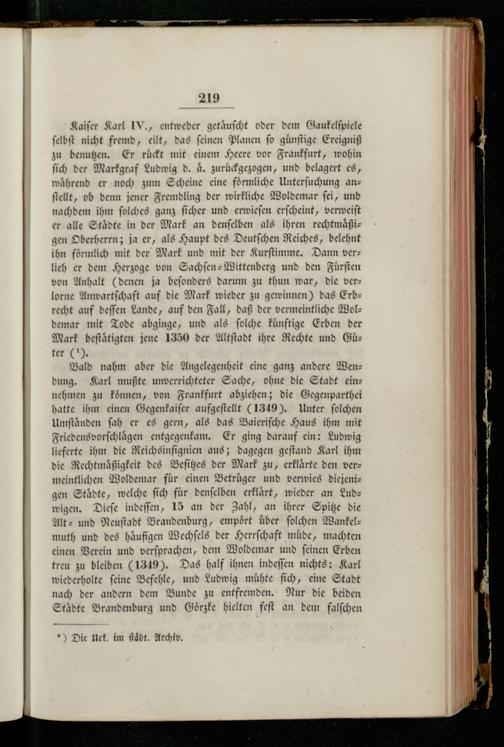 Kaiſer Karl IV., entweder getaͤuſcht oder dem Gaukelſpiele ſelbſt nicht fremd, eilt, das ſeinen Planen ſo guͤnſtige Ereigniß zu benutzen. Er rückt mit einem Heere vor Frankfurt, wohin ſich der Markgraf Ludwig d. a. zurückgezogen, und belagert es, während er noch zum Scheine eine foͤrmliche Unterſuchung an— ſtellt, ob denn jener Fremdling der wirkliche Woldemar ſei, und nachdem ihm ſolches ganz ſicher und erwieſen erſcheint, verweiſt er alle Städte in der Mark an denſelben als ihren rechtmaͤßigen Oberherrn; ja er, als Haupt des Deutſchen Reiches, belehnt ihn foͤrmlich mit der Mark und mit der Kurſtimme. Dann ver— lieh er dem Herzoge von Sachſen-Wittenberg und den Fuͤrſten von Anhalt(denen ja beſonders darum zu thun war, die verz lorne Anwartſchaft auf die Mark wieder zu gewinnen) das Erb— recht auf deſſen Lande, auf den Fall, daß der vermeintliche Wol—demar mit Tode abginge, und als ſolche kuͤnftige Erben der Mark beſtaͤtigten jene 1350 der Altſtadt ihre Rechte und Guͤter(1)