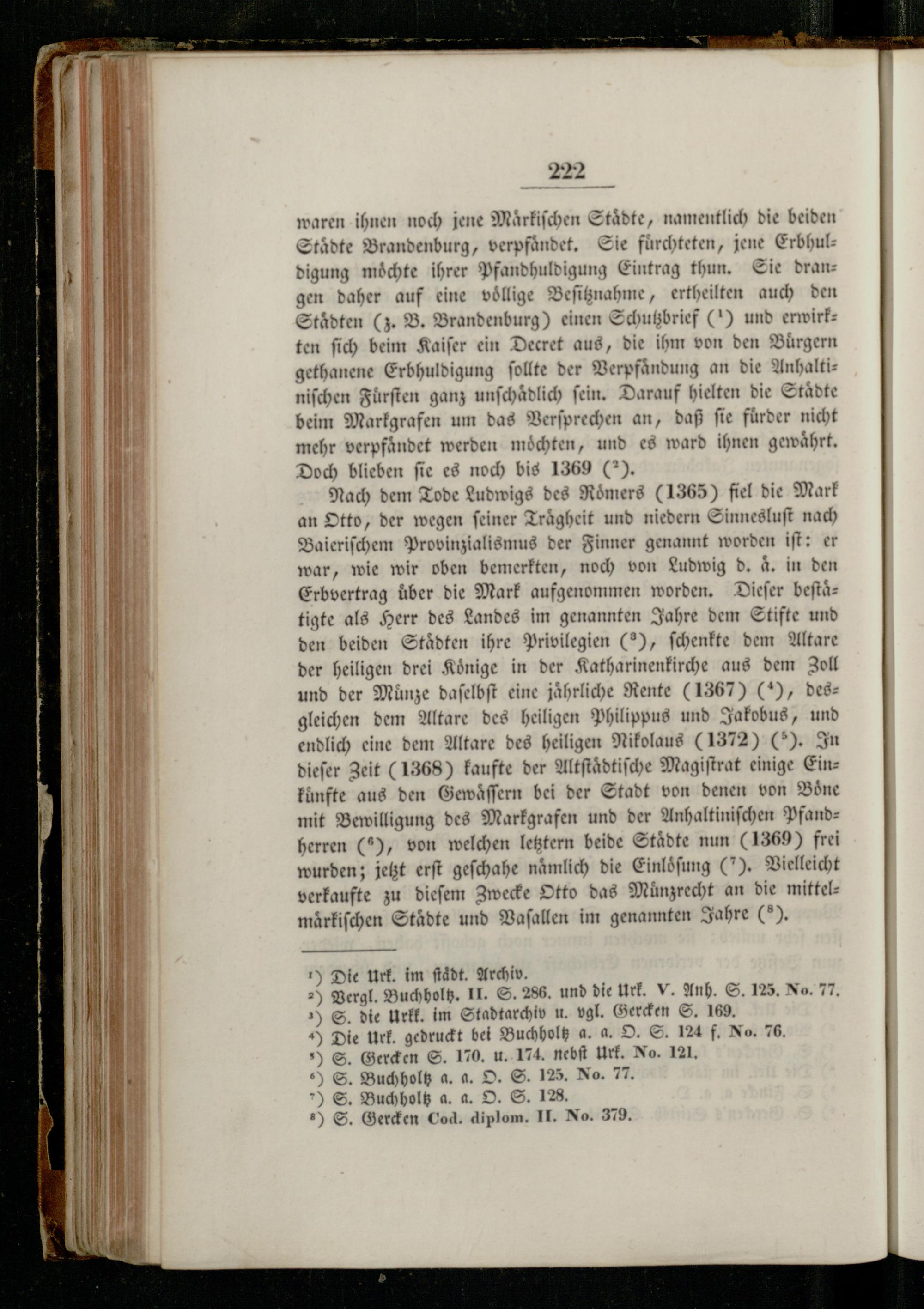 Nach dem Tode Ludwigs des Roͤmers(1365) fiel die Mark an Otto, der wegen ſeiner Trägheit und niedern Sinnesluſt nach Baieriſchem Provinzialismus der Finner genannt worden iſt: er war, wie wir oben bemerkten, noch von Ludwig d. a. in den Erbvertrag über die Mark aufgenommen worden. Dieſer beſtaͤtigte als Herr des Landes im genannten Jahre dem Stifte und den beiden Städten ihre Privilegien(2), ſchenkte dem Altare der heiligen drei Könige in der Katharinenkirche aus dem Zoll und der Münze daſelbſt eine jährliche Rente(1367)(“), desgleichen dem Altare des heiligen Philippus und Jakobus, und endlich eine dem Altare des heiligen Nikolaus(1372)(5). In dieſer Zeit(1368) kaufte der Altſtaͤdtiſche Magiſtrat einige EinFünfte aus den Gewaͤſſern bei der Stadt von denen von Boͤne mit Bewilligung des Markgrafen und der Anhaltiniſchen Pfandherren(2), von welchen letztern beide Staͤdte nun(1369) frei wurden; jetzt erſt geſchahe nämlich die Einloͤſung(7). Vielleicht verkaufte zu dieſem Zwecke Otto das Munzrecht an die mittelmaͤrkiſchen Städte und Vaſallen im genannten Jahre(5).