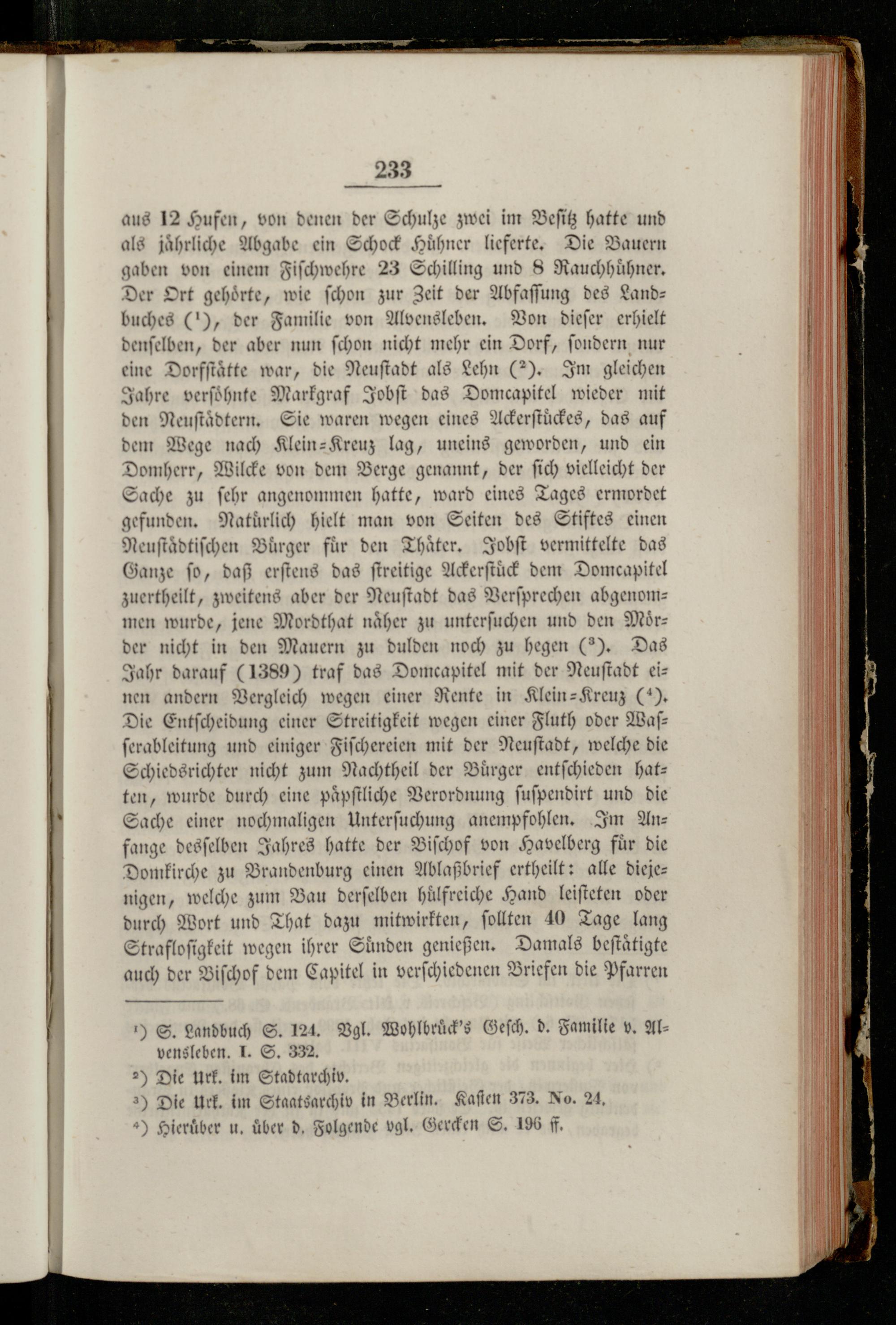 aus 12 Hufen, von denen der Schulze zwei im Beſitz hatte und als jährliche Abgabe ein Schock Huͤhner lieferte. Die Bauern gaben von einem Fiſchwehre 23 Schilling und 8 Rauchhuͤhner. Der Ort gehörte, wie ſchon zur Zeit der Abfaſſung des Land— buches(1), der Familie von Alvensleben. Von dieſer erhielt denſelben, der aber nun ſchon nicht mehr ein Dorf, ſondern nur eine Dorfſtaͤtte war, die Neuſtadt als Lehn(2). Im 2 Jahre verſoͤhnte Markgraf Jobſt das Domcapitel wieder mit den Neuſtaͤdtern. Sie waren wegen eines Ackerſtuͤckes, das auf dem Wege nach Klein-Kreuz lag, uneins geworden, und ein Domherr, Wilcke von dem Berge genannt, der ſich vielleicht der Sache zu ſehr angenommen hatte, ward eines Tages ermordet gefunden. Natuͤrlich hielt man von Seiten des Stiftes einen Neuſtaͤdtiſchen Burger für den Thaͤter. Jobſt vermittelte das Ganze fo, daß erſtens das ſtreitige Ackerſtuͤck dem Domcapitel zuertheilt, zweitens aber der Neuſtadt das Verſprechen abgenom— men wurde, jene Mordthat naͤher zu unterſuchen und den Moͤr— der nicht in den Mauern zu dulden noch zu hegen(2). Das Jahr darauf(1389) traf das Domcapitel mit der Neuſtadt ei: nen andern Vergleich wegen einer Rente in Klein-Kreuz(5). Die Entſcheidung einer Streitigkeit wegen einer Fluth oder Waſ— ſerableitung und einiger Fiſchereien mit der Neuſtadt, welche die Schiedsrichter nicht zum Nachtheil der Buͤrger entſchieden hatten, wurde durch eine puͤpſtliche Verordnung ſuſpendirt und die Sache einer nochmaligen Unterſuchung anempfohlen. Im Anfange desſelben Jahres hatte der Biſchof von Havelberg fuͤr die Domkirche zu Brandenburg einen Ablaßbrief ertheilt: alle diejenigen, welche zum Bau derſelben huͤlfreiche Hand leiſteten oder durch Wort und That dazu mitwirkten, ſollten 40 Tage lang Strafloſigkeit wegen ihrer Sünden genießen. Damals beſtaͤtigte auch der Biſchof dem Capitel in verſchiedenen Briefen die Pfarren
