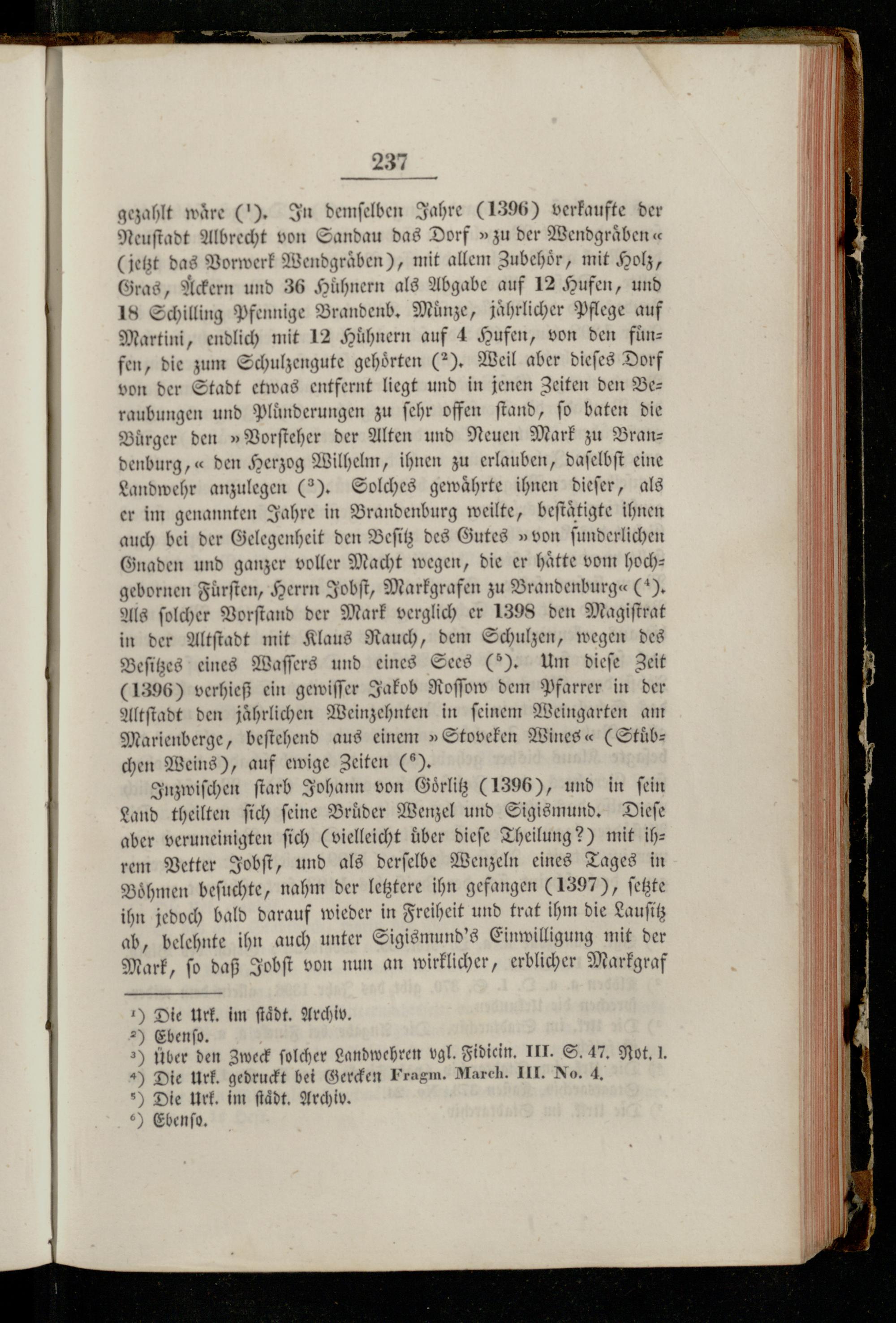 gezahlt wäre(1). In demſelben Jahre(1396) verkaufte der Neuſtadt Albrecht von Sandau das Dorf» zu der Wendgraͤben« (jetzt das Vorwerk Wendgraͤben), mit allem Zubehör, mit Holz, Gras, Ackern und 36 Hühnern als Abgabe auf 12 Hufen, und 18 Schilling Pfennige Brandenb. Münze, jaͤhrlicher Pflege auf Martini, endlich mit 12 Huͤhnern auf 4 Hufen, von den fünz fen, die zum Schulzengute gehörten(2). Weil aber dieſes Dorf von der Stadt etwas entfernt liegt und in jenen Zeiten den Bes raubungen und Pluͤnderungen zu ſehr offen ſtand, ſo baten die Bürger den»Vorſteher der Alten und Neuen Mark zu Brandenburg,« den Herzog Wilhelm, ihnen zu erlauben, daſelbſt eine Landwehr anzulegen(3). Solches gewährte ihnen dieſer, als er im genannten Jahre in Brandenburg weilte, beſtaͤtigte ihnen auch bei der Gelegenheit den Beſitz des Gutes» von ſunderlichen Gnaden und ganzer voller Macht wegen, die er hätte vom hoch—gebornen Fürſten, Herrn Jobſt, Markgrafen zu Brandenburg«(). Als ſolcher Vorſtand der Mark verglich er 1398 den Magiſtrat in der Altſtadt mit Klaus Rauch, dem Schulzen, wegen des Beſitzes eines Waſſers und eines Sees(5). Um dieſe Zeit (1396) verhieß ein gewiſſer Jakob Roſſow dem Pfarrer in der Altſtadt den jährlichen Weinzehnten in feinem Weingarten am Marienberge, beſtehend aus einem»Stoveken Wines«(Stuͤbchen Weins), auf ewige Zeiten(5.