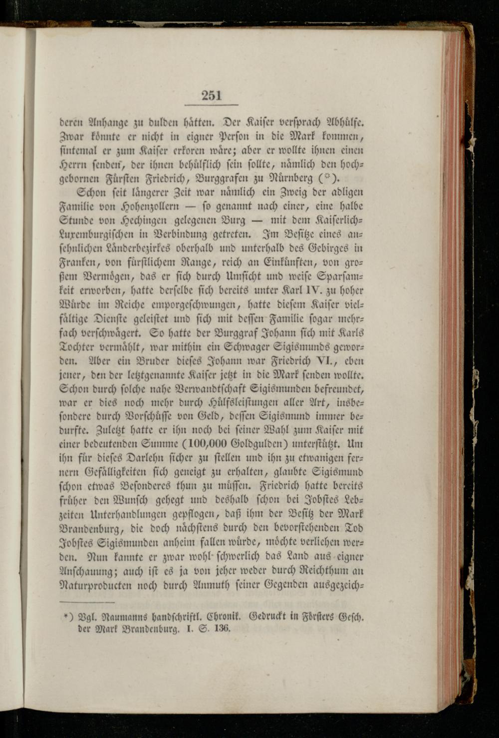 Luxemburgiſchen in Verbindung getreten. Im Beſitze eines anſehnlichen Laͤnderbezirkes oberhalb und unterhalb des Gebirges in Franken, von fuͤrſtlichem Range, reich an Einkuͤnften, von gro— ßem Vermoͤgen, das er ſich durch Umſicht und weiſe Sparſam— keit erworben, hatte derſelbe ſich bereits unter Karl IV. zu hoher Würde im Reiche emporgeſchwungen, hatte dieſem Kaiſer viel— faͤltige Dienſte geleiſtet und ſich mit deſſen Familie ſogar mehr— fach verſchwaͤgert. So hatte der Burggraf Johann ſich mit Karls Tochter vermaͤhlt, war mithin ein Schwager Sigismunds gewor— den. Aber ein Bruder dieſes Johann war Friedrich VI., eben jener, den der letztgenannte Kaiſer jetzt in die Mark ſenden wollte. Schon durch ſolche nahe Verwandtſchaft Sigismunden befreundet, war er dies noch mehr durch Huͤlfsleiſtungen aller Art, insbe— ſondere durch Vorſchuͤſſe von Geld, deſſen Sigismund immer bedurfte. Zuletzt hatte er ihn noch bei ſeiner Wahl zum Kaiſer mit einer bedeutenden Summe(100,000 Goldgulden) unterſtuͤtzt. Um ihn für dieſes Darlehn ſicher zu ſtellen und ihn zu etwanigen fer— nern Gefaͤlligkeiten ſich geneigt zu erhalten, glaubte Sigismund ſchon etwas Beſonderes thun zu muͤſſen. Friedrich hatte bereits früher den Wunſch gehegt und deshalb ſchon bei Jobſtes Lebzeiten Unterhandlungen gepflogen, daß ihm der Beſitz der Mark Brandenburg, die doch naͤchſtens durch den bevorſtehenden Tod Jobſtes Sigismunden anheim fallen würde, möchte verliehen werz den. Nun kannte er zwar wohl ſchwerlich das Land aus eigner Anſchauung; auch iſt es ja von jeher weder durch Reichthum an Naturproducten noch durch Anmuth feiner Gegenden ausgezeich
