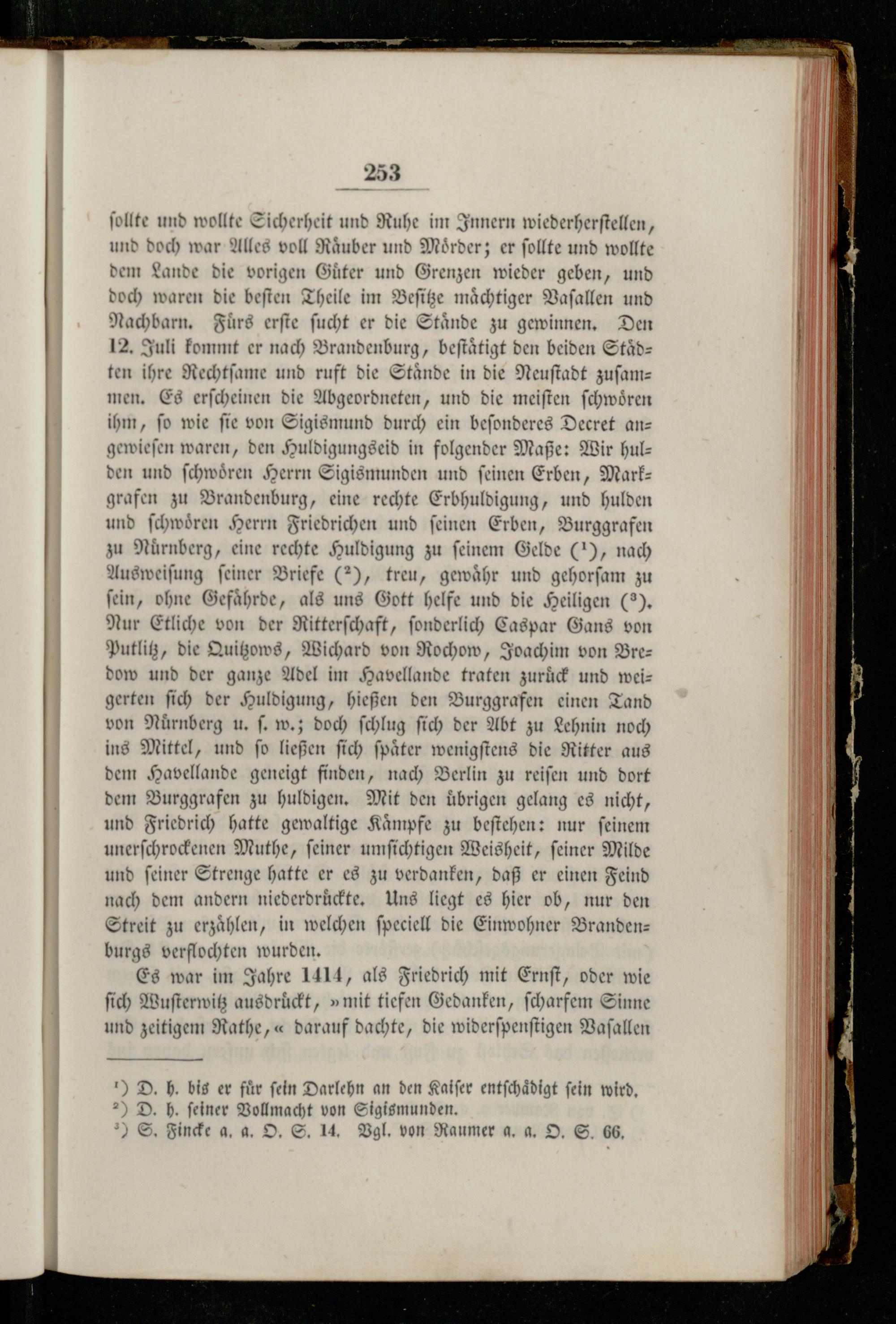 ſollte und wollte Sicherheit und Ruhe im Innern wiederherſtellen, und doch war Alles voll Räuber und Mörder; er ſollte und wollte dem Lande die vorigen Güter und Grenzen wieder geben, und doch waren die beſten Theile im Beſitze maͤchtiger Vaſallen und Nachbarn. Furs erſte ſucht er die Stände zu gewinnen. Den 12. Juli kommt er nach Brandenburg, beſtaͤtigt den beiden Staͤdten ihre Rechtſame und ruft die Stände in die Neuſtadt zuſam— men. Es erſcheinen die Abgeordneten, und die meiſten ſchwoͤren ihm, ſo wie ſie von Sigismund durch ein beſonderes Decret an— gewieſen waren, den Huldigungseid in folgender Maße: Wir hul— den und ſchwoͤren Herrn Sigismunden und feinen Erben, Mark— grafen zu Brandenburg, eine rechte Erbhuldigung, und hulden und ſchwoͤren Herrn Friedrichen und feinen Erben, Burggrafen zu Nürnberg, eine rechte Huldigung zu feinem Gelde(1), nach Ausweiſung feiner Briefe(?), treu, gewahr und gehorſam zu fein, ohne Gefaͤhrde, als uns Gott helfe und die Heiligen(3). Nur Etliche von der Ritterſchaft, ſonderlich Caspar Gans von Putlitz, die Quitzows, Wichard von Rochow, Joachim von Bre— dow und der ganze Adel im Havellande traten zuruͤck und wei— gerten ſich der Huldigung, hießen den Burggrafen einen Tand von Nurnberg u. ſ. w.; doch ſchlug ſich der Abt zu Lehnin noch ins Mittel, und ſo ließen ſich ſpaͤter wenigſtens die Ritter aus dem Havellande geneigt finden, nach Berlin zu reiſen und dort dem B Burggeafen zu huldigen. Mit den uͤbrigen gelang es nicht, und Friedrich hatte gewaltige Kaͤmpfe zu beſtehen: nur ſeinem unerſchrockenen Muthe, ſeiner umſichtigen Weisheit, ſeiner Milde und ſeiner Strenge hatte er es zu verdanken, daß er einen Feind nach dem andern niederdruͤckte. Uns liegt es hier ob, nur den Streit zu erzählen, in welchen ſpeciell die Einwohner Brandenburgs verflochten wurden.