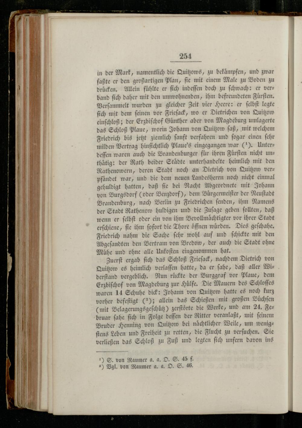 Zuerſt ergab ſich das Schloß Frieſack, nachdem Dietrich von Quitzow es heimlich verlaſſen hatte, da er ſahe, daß aller Widerſtand vergeblich. Nun rückte der Burggraf vor Plaue, dem Erzbiſchof von Magdeburg zur Hülfe. Die Mauern des Schloſſes waren 14 Schuhe dick: Johann von Quitzow hatte es noch kurz vorher befeſtigt(2); allein das Schießen mit großen Buͤchſen (mit Belagerungsgeſchuͤtz) zerſtoͤrte die Werke, und am 24. Fe bruar ſahe ſich in Folge deſſen der Ritter veranlaßt, mit ſeinem Bruder Henning von Quitzow bei nächtlicher Weile, um wenig ſtens Leben und Freiheit zu retten, die Flucht zu verſuchen. Sie verließen das Schloß zu Fuß und legten ſich unfern davon ins