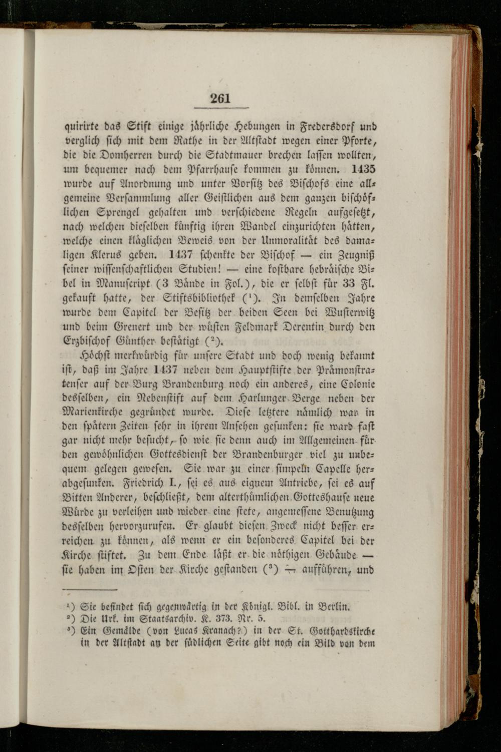 Hoͤchſt merkwuͤrdig für unſere Stadt und doch wenig bekannt iſt, daß im Jahre 1437 neben dem Hauptſtifte der Praͤmonſtra— tenſer auf der Burg Brandenburg noch ein anderes, eine Colonie desſelben, ein Nebenſtift auf dem Harlunger Berge neben der Marienkirche gegründet wurde. Dieſe letztere nämlich wan in den ſpaͤtern Zeiten ſehr in ihrem Anſehen geſunken: ſie ward faſt gar nicht mehr beſucht, ſo wie ſie denn auch im Allgemeinen fuͤr den gewoͤhnlichen Gottesdienſt der Brandenburger viel zu unbe— quem gelegen geweſen. Sie war zu einer ſimpeln Capelle her— abgeſunken. Friedrich L, ſei es aus eignem Antriebe, ſei es auf Bitten Anderer, beſchließt, dem alterthuͤmlichen Gotteshauſe neue Wurde zu verleihen und wieder eine ſtete, angemeſſene Benutzung desſelben hervorzurufen. Er glaubt dieſen Zweck nicht beſſer er— reichen zu koͤnnen, als wenn er ein beſonderes Capitel bei der Kirche ſtiftet. Zu dem Ende laͤßt er die noͤthigen Gebäude:— fie haben im Offen. der Kirche geſtanden(2)— auffuͤhren, und