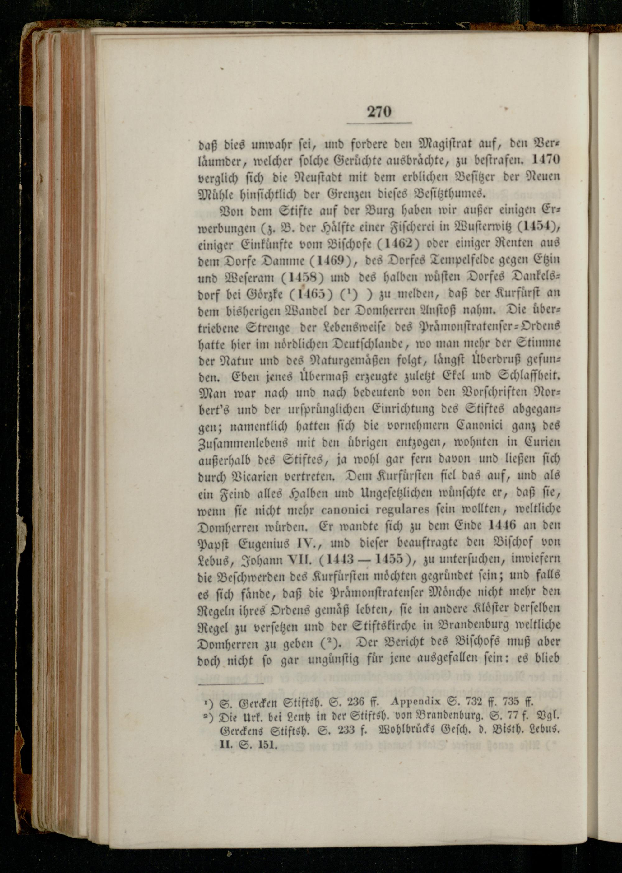Von dem Stifte auf der Burg haben wir außer einigen Erwerbungen(z. B. der Hälfte einer Fiſcherei in Wuſterwitz(1154), einiger Einkuͤnfte vom Biſchofe(162) oder einiger Renten aus dem Dorfe Damme(1469), des Dorfes Tempelfelde gegen Etzin und Weſeram(1458) und des halben wuſten Dorfes Dankelsdorf bei Goͤrzke(1165)(1)) zu melden, daß der Kurfürft an dem bisherigen Wandel der Dam beren Anſtoß nahm. Die übertriebene Strenge der Lebensweiſe des Praäͤmonſtratenſer-Ordens hatte hier im noͤrdlichen Deutſchlande, wo man mehr der Stimme der Natur und des Naturgemaͤßen folgt, laͤngſt Überdruß gefunden. Eben jenes üͤbermaß erzeugte zuletzt Ekel und Schlaffheit. Man war nach und nach bedeutend von den Vorſchriften Nor— bert's und der urſpruͤnglichen Einrichtung des Stiftes abgegangen; namentlich hatten ſich die vornehmern Canonici ganz des en nen, mit den übrigen entzogen, wohnten in Curien außerhalb des Stiftes, ja wohl gar fern davon und ließen ſich durch Vicarien— Dem Kurfuͤrſten fiel das auf, und als ein Feind alles Halben und Ungeſetzlichen wunſchte er, daß fie, wenn ſie nicht mehr canonici regulares fein wollten, weltliche Domherren würden, Er wandte ſich zu dem Ende 1416 an den Papſt Eugenius IV., und dieſer beauftragte den Biſchof von Lebus, Johann VII.(1113— 1455), zu unterſuchen, inwiefern die Beſchwerden des Kurfürften möchten gegründet fein; und falls es ſich fände, d 26 die Praͤmonſtratenſer Moͤnche nicht mehr den Regeln ihres Ordens gemaͤß lebten, ſie in andere Kloͤſter derſelben Regel zu— und der Stiftskirche in Brandenburg weltliche Domherren zu geben(2). Der Bericht des Biſchofs muß aber doch nicht fo gar ungünftig für jene ausgefallen ſein: es blieb