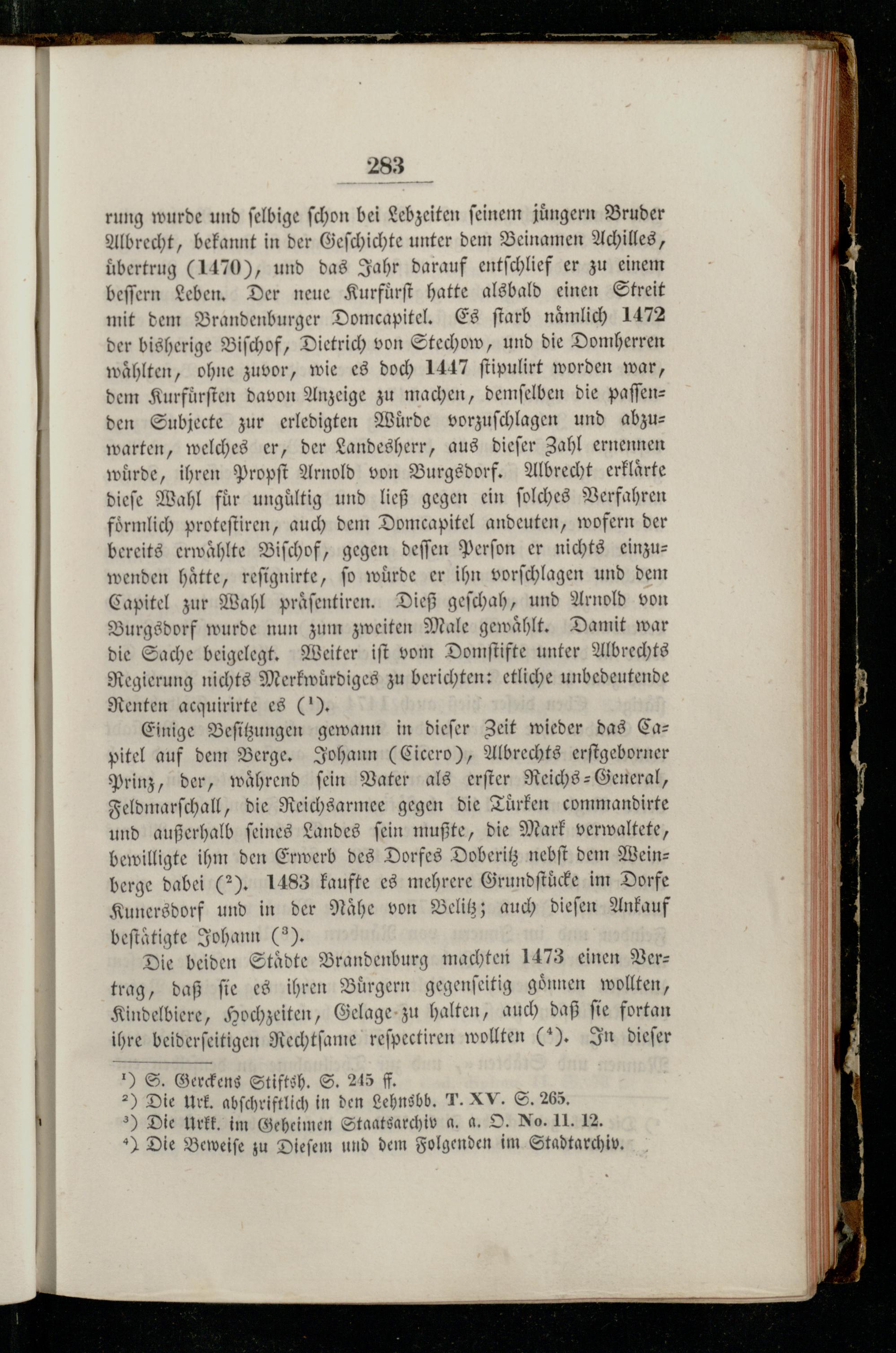 Albrecht, bekannt in der Geſchichte unter dem Beinamen Achilles, übertrug(1470), und das Jahr darauf entſchlief er zu einem beſſern Leben. Der neue Kurfuͤrſt hatte alsbald einen Streit mit dem Brandenburger Domcapitel. Es ſtarb nämlich 1472 der bisherige Biſchof, Dietrich von Stechow, und die Domherren waͤhlten, ohne zuvor, wie es doch 1447 ſtipulirt worden war, dem Kurfuͤrſten davon Anzeige zu machen, demſelben die paffenz den Subjecte zur erledigten Würde vorzuſchlagen und abzu— warten, welches er, der Landesherr, aus dieſer Zahl ernennen wuͤrde, ihren Propſt Arnold von Burgsdorf. Albrecht erklaͤrte dieſe Wahl fuͤr unguͤltig und ließ gegen ein ſolches Verfahren förmlich proteſtiren, auch dem Domcapitel andeuten, wofern der bereits erwaͤhlte Biſchof, gegen d deſſen Perſon er nichts einzu— wenden hätte, reſignirte, fo würde er ihn vorſchlagen und dem Capitel zur Wahl praͤſentiren. Dieß geſchah, und Arnold von Burgsdorf wurde nun zum zweiten Male gewählt, Damit war die Sache beigelegt. Weiter iſt vom Domſtifte unter Albrechts Regierung nichts Merkwuͤrdiges zu berichten: etliche unbedeutende Renten acquirirte es(1).