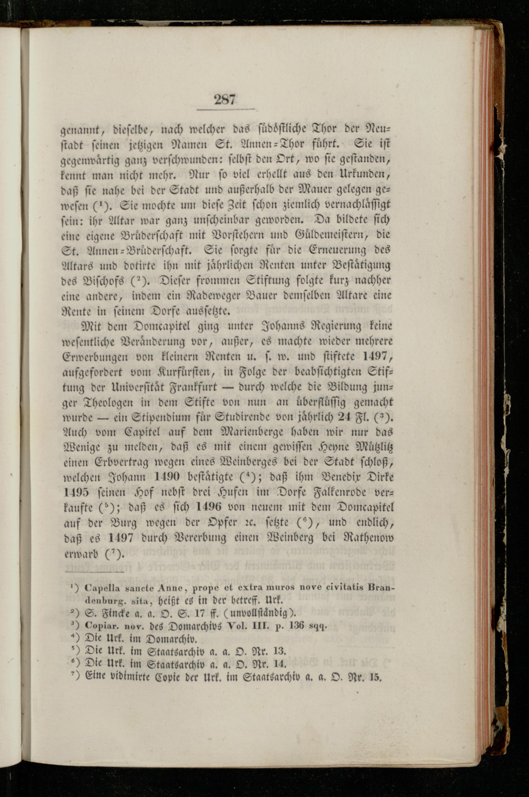 Mit dem Domcapitel ging unter Johanns Regierung keine weſentliche Veraͤnderung vor, außer, es machte wieder mehrere Erwerbungen von kleinern Renten u. ſ. w. und ſtiftete 1497, aufgefordert vom Kurfuͤrſten, in Folge der beabſichtigten Stif— tung der Univerſitaͤt Frankfurt— durch welche die Bildung junz ger Theologen in dem Stifte von nun an uͤberfluͤſſig gemacht wurde— ein Stipendium für Studirende von jährlich 24 Fl.(3. Auch vom Capitel auf dem Marienberge haben wir nur das Wenige zu melden, daß es mit einem gewiſſen Heyne Muͤtzlitz einen Erbvertrag wegen eines Weinberges bei der Stadt ſchloß, welchen Johann 1490 beſtaͤtigte(2); daß ihm Benedix Dirke 1495 ſeinen Hof nebſt drei Hufen im Dorfe Falkenrode verkaufte(5); daß es ſich 1496 von neuem mit dem Domcapitel auf der Burg wegen der Opfer ꝛc. ſetzte(5), und endlich, daß es 1197 durch Vererbung einen Weinberg bei Rathenow erwarb(7).