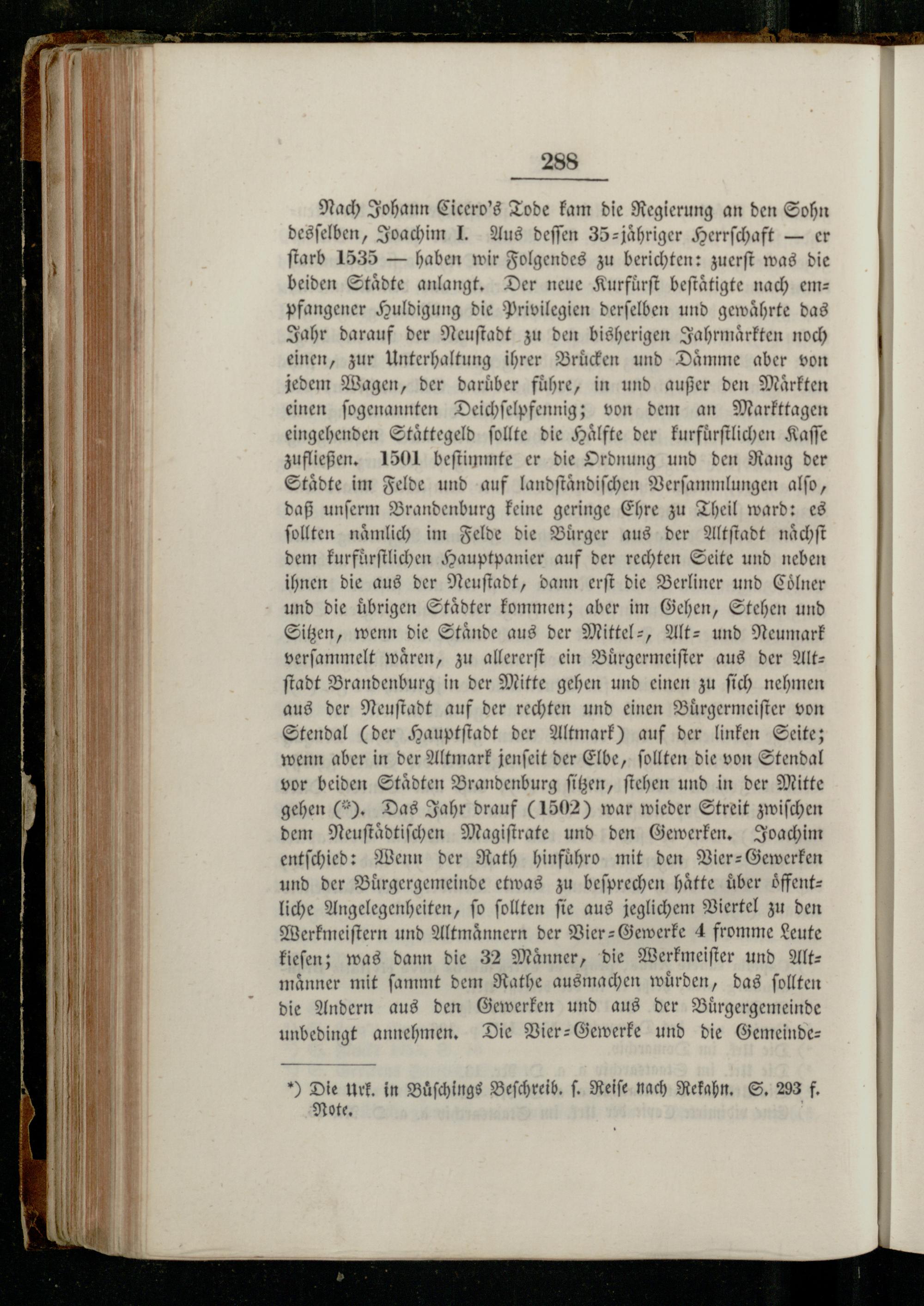Nach Johann Cicero's Tode kam die Regierung an den Sohn desſelben, Joachim J. Aus deſſen 35=jähriger Herrſchaft— er ſtarb 1535— haben wir Folgendes zu berichten: zuerſt was die beiden Städte anlangt. Der neue Kurfuͤrſt beſtaͤtigte nach empfangener Huldigung die Privilegien derſelben und gewaͤhrte das Jahr darauf der Neuſtadt zu den bisherigen Jahrmaͤrkten noch einen, zur Unterhaltung ihrer Brücken und Daͤmme aber von jedem Wagen, der daruͤber führe, in und außer den Märkten einen ſogenannten Deichſelpfennig; von dem an Markttagen eingehenden Staͤttegeld ſollte die Halfte der kurfuͤrſtlichen Kaffe zufließen. 1501 beſtimmte er die Ordnung und den Rang der Städte im Felde und auf landſtaͤndiſchen Verſammlungen alſo, daß unſerm Brandenburg keine geringe Ehre zu Theil ward: es ſollten naͤmlich im Felde die Buͤrger aus der Altſtadt naͤchſt dem kurfuͤrſtlichen Hauptpanier auf der rechten Seite und neben ihnen die aus der Neuſtadt, dann erſt die Berliner und Coͤlner und die ubrigen Staͤdter kommen; aber im Gehen, Stehen und Sitzen, wenn die Staͤnde aus der Mittel-, Alt- und Neumark verſammelt wären, zu allererſt ein Buͤrgermeiſter aus der Altſtadt Brandenburg in der Mitte gehen und einen zu ſich nehmen aus der Neuſtadt auf der rechten und einen Buͤrgermeiſter von Stendal(der Hauptſtadt der Altmark) auf der linken Seite; wenn aber in der Altmark jenſeit der Elbe, ſollten die von Stendal vor beiden Staͤdten Brandenburg ſitzen, ſtehen und in der Mitte gehen(6). Das Jahr drauf(1502) war wieder Streit zwiſchen dem Neuſtaͤdtiſchen Magiſtrate und den Gewerken. Joachim entſchied: Wenn der Rath hinfuͤhro mit den Vier-Gewerken und der Burgergemeinde etwas zu beſprechen hätte über oͤffent— liche Angelegenheiten, ſo ſollten ſie aus jeglichem Viertel zu den Werkmeiſtern und Altmaͤnnern der Vier-Gewerke 4 fromme Leute kieſen; was dann die 32 Maͤnner, die Werkmeiſter und Alt— maͤnner mit ſammt dem Rathe ausmachen wuͤrden, das ſollten die Andern aus den Gewerken und aus der Buͤrgergemeinde unbedingt annehmen. Die Vier-Gewerke und die Gemeinde: Y Die urk. in Buͤſchings Beſchreib. ſ. Reife nach Rekahn. S. 293 f.