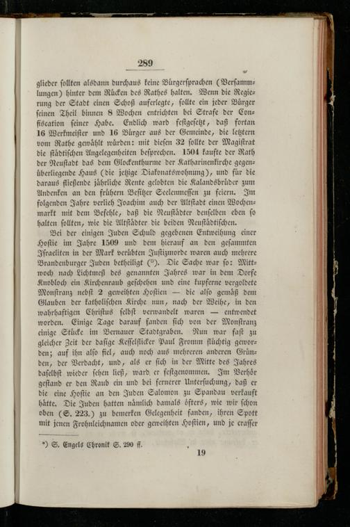 Bei der einigen Juden Schuld gegebenen Entweihung einer Hoſtie im Jahre 1509 und dem hierauf an den geſammten Iſraeliten in der Mark veruͤbten Juſtizmorde waren auch mehrere Brandenburger Juden betheiligt(). Die Sache war fo: Mittwoch nach Lichtmeß des genannten Jahres war in dem Dorfe Knobloch ein Kirchenraub geſchehen und eine kupferne vergoldete Monſtranz nebſt 2 geweihten Hoſtien— die alſo gemaͤß dem Glauben der katholiſchen Kirche nun, nach der Weihe, in den wahrhaftigen Chriſtus ſelbſt verwandelt waren— entwendet worden. Einige Tage darauf fanden ſich von der Monſtranz einige Stücke im Bernauer Stadtgraben. Nun war faſt zu gleicher Zeit der daſige Keſſelflicker Paul Fromm flüchtig gewor— den; auf ihn alſo fiel, auch noch aus mehreren anderen Gruͤnden, der Verdacht, und, als er ſich in der Mitte des Jahres daſelbſt wieder ſehen ließ, ward er feſtgenommen. Im Verhoͤr geſtand er den Raub ein und bei fernerer Unterſuchung, daß er die eine Hoſtie an den Juden Salomon zu Spandau verkauft haͤtte. Die Juden hatten naͤmlich damals oͤfters, wie wir ſchon oben(S. 223.) zu bemerken Gelegenheit fanden, ihren Spott mit jenen Frohnleichnamen oder geweihten Hoſtien, und je craſſer Y) S. Engels Chronik S. 290 ff.