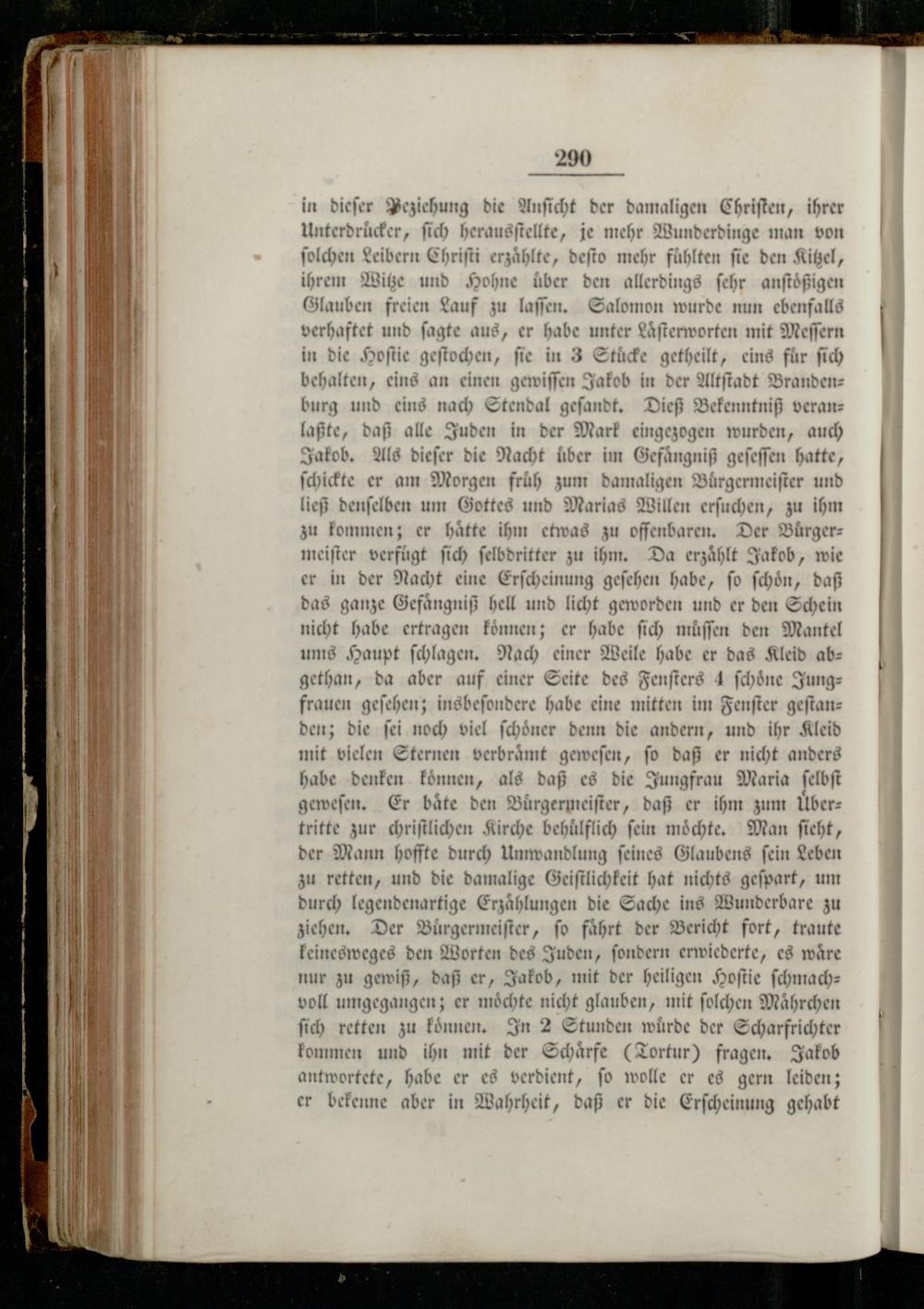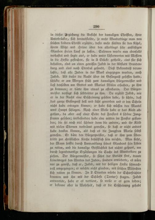 in dieſer Beziehung die Anſicht der damaligen Chriſten, ihrer Unterdrücker, ſich herausſtellte, je mehr Wunderdinge man von ſolchen Leibern Chriſti erzählte, deſto mehr fühlten fie den Kitzel, ihrem Witze und Hohne uber den allerdings ſehr anſtoͤßigen Glauben freien Lauf zu laſſen. Salomon wurde nun ebenfalls verhaftet und ſagte aus, er habe unter Laͤſterworten mit Meſſern in die Hoſtie geſtochen, fie in 3 Stücke getheilt, eins für ſich behalten, eins an einen gewiſſen Jakob in der Altſtadt Brandenburg und eins nach Stendal geſandt. Dieß Bekenntniß veranlaßte, daß alle Juden in der Mark eingezogen wurden, auch Jakob. Als dieſer die Nacht über im Gefaͤngniß geſeſſen hatte, ſchickte er am Morgen früh zum damaligen Buͤrgermeiſter und ließ denſelben um Gottes und Marias Willen erſuchen, zu ihm zu kommen; er hätte ihm etwas zu offenbaren. Der Bürger: meiſter verfügt ſich ſelbdritter zu ihm. Da erzaͤhlt Jakob, wie er in der Nacht eine Erſcheinung geſehen habe, ſo ſchoͤn, daß das ganze Gefaͤngniß hell und licht geworden und er den Schein nicht habe ertragen koͤnnen; er habe ſich muͤſſen den Mantel ums Haupt ſchlagen. Nach einer Weile habe er das Kleid ab— gethan, da aber auf einer Seite des Fenſters 4 ſchoͤne Jungfrauen geſehen; insbeſondere habe eine mitten im Fenſter geſtanden; die ſei noch viel ſchoͤner denn die andern, und ihr Kleid mit vielen Sternen verbraͤmt geweſen, ſo daß er nicht anders habe denken koͤnnen, als daß es die Jungfrau Maria ſelbſt geweſen. Er baͤte den Buͤrgermeiſter, daß er ihm zum Über: tritte zur chriſtlichen Kirche behülflich fein möchte, Man ſieht, der Mann hoffte durch Umwandlung ſeines Glaubens ſein Leben zu retten, und die damalige Geiſtlichkeit hat nichts geſpart, um durch legendenartige Erzählungen die Sache ins Wunderbare zu ziehen. Der Buͤrgermeiſter, fo fährt der Bericht fort, traute keinesweges den Worten des Juden, ſondern erwiederte, es waͤre nur zu gewiß, daß er, Jakob, mit der heiligen Hoſtie ſchmach—voll umgegangen; er moͤchte nicht glauben, mit ſolchen Maͤhrchen ſich retten zu koͤnnen. In 2 Stunden wuͤrde der Scharfrichter kommen und ihn mit der Schaͤrfe(Tortur) fragen. Jakob antwortete, habe er es verdient, ſo wolle er es gern leiden; er bekenne aber in Wahrheit, daß er die Erſcheinung gehabt