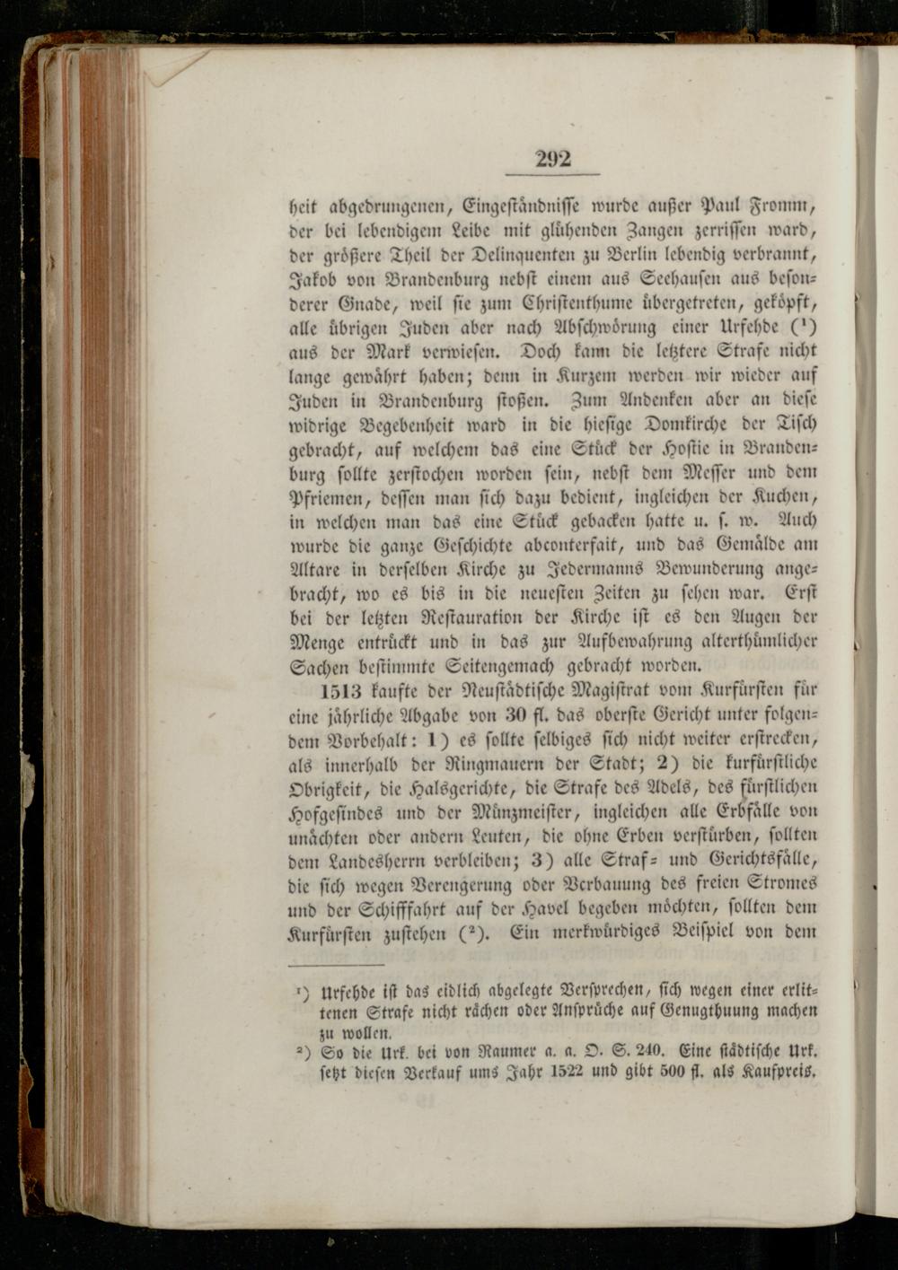 292 heit abgedrungenen, Eingeftändniffe wurde außer Paul Fromm, der bei lebendigem Leibe mit gluͤhenden Zangen zerriſſen ward der größere Theil der Delinquenten zu Berlin lebendig verbrannt, Jakob von Brandenburg nebſt einem aus Seehauſen aus beſonderer Gnade, weil fie zum Chriſtenthume uͤbergetreten, gekoͤpft, alle übrigen Juden aber nach Abſchwoͤrung einer Urfehde(7) aus der Mark verwieſen. Doch kann die letztere Strafe nicht