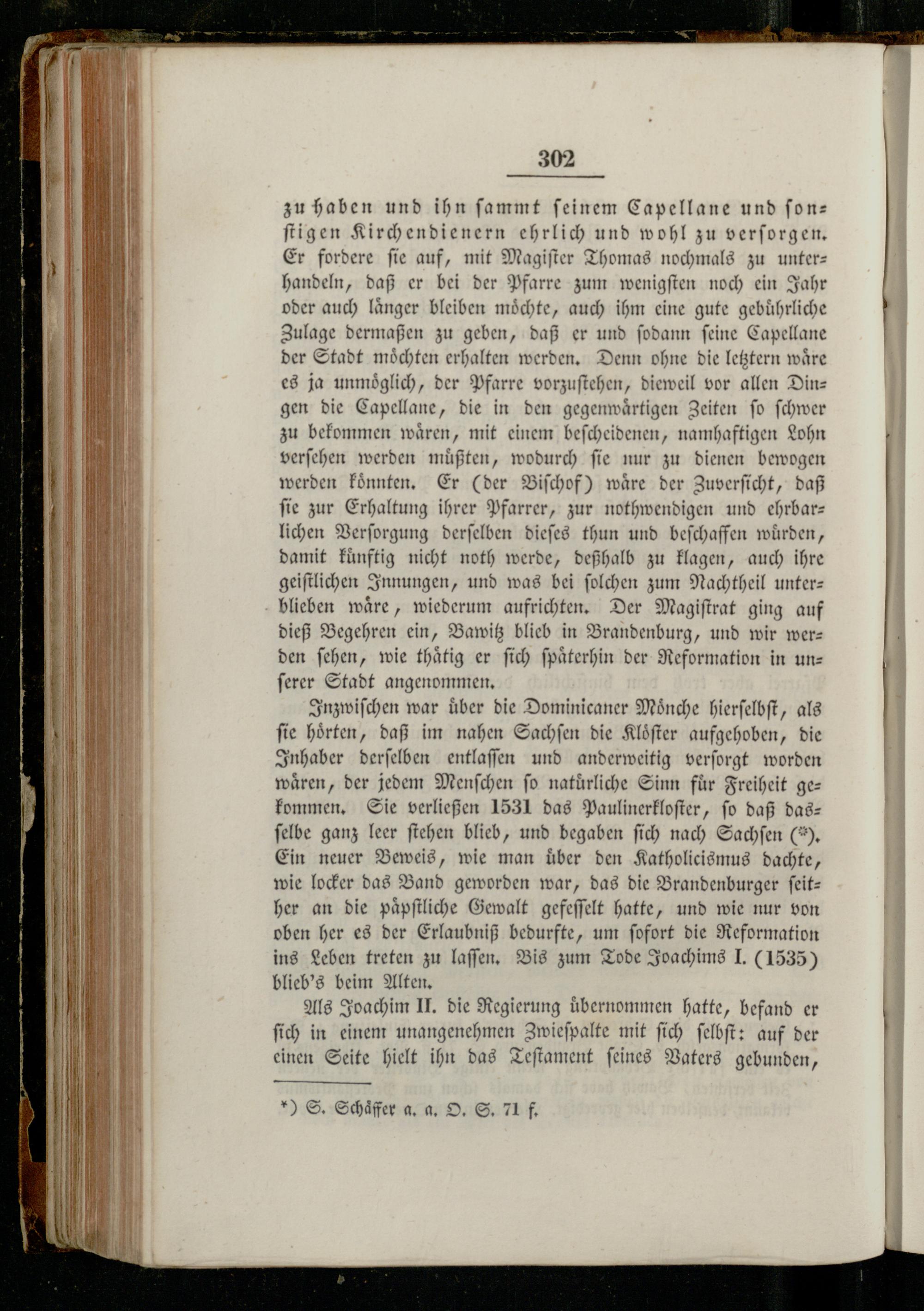 Inzwiſchen war uͤber die Dominicaner Moͤnche hierſelbſt, als ſie hoͤrten, daß im nahen Sachſen die Kloͤſter aufgehoben, die Inhaber derſelben entlaſſen und anderweitig verſorgt worden wären, der jedem Menſchen fo natuͤrliche Sinn für Freiheit gez kommen. Sie verließen 1531 das Paulinerkloſter, fo daß dasſelbe ganz leer ſtehen blieb, und begaben ſich nach Sachſen(. Ein neuer Beweis, wie man uͤber den Katholicismus dachte, wie locker das Band geworden war, das die Brandenburger ſeither an die paͤpſtliche Gewalt gefeſſelt hatte, und wie nur von oben her es der Erlaubniß bedurfte, um ſofort die Reformation ins Leben treten zu laſſen. Bis zum Tode Joachims J.(1535) blieb's beim Alten.
