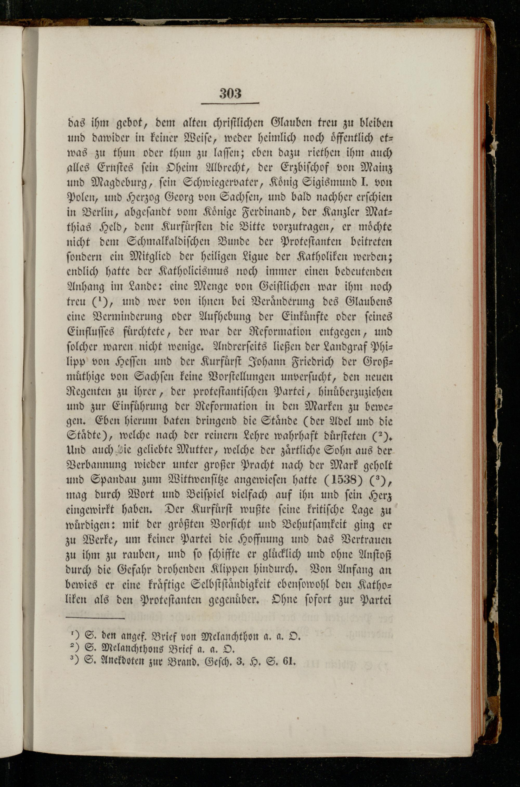 das ihm gebot, dem alten chriſtlichen Glauben treu zu bleiben und dawider in keiner Weiſe, weder heimlich noch oͤffentlich etwas zu thun oder thun zu laſſen; eben dazu riethen ihm auch alles Ernſtes ſein Oheim Albrecht, der Erzbiſchof von Mainz und Magdeburg, ſein Schwiegervater, Koͤnig Sigismund J. von Polen, und Herzog Georg von Sachſen, und bald nachher erſchien in Berlin, abgeſandt vom Könige Ferdinand, der Kanzler Mat— thias Held, dem Kurfuͤrſten die Bitte vorzutragen, er moͤchte nicht dem Schmalkaldiſchen Bunde der Proteſtanten beitreten ſondern ein Mitglied der heiligen Ligue der Katholiken werden; endlich hatte der Katholicismus noch immer einen bedeutenden Anhang im Lande: eine Menge von Geiſtlichen war ihm noch treu(i), und wer von ihnen bei Veränderung des Glaubens eine Verminderung oder Aufhebung der Einkuͤnfte oder ſeines Einfluſſes fuͤrchtete, der war der Reformation entgegen, und ſolcher waren nicht wenige. Andrerſeits ließen der Landgraf Phi— lipp von Heſſen und der Kurfuͤrſt Johann Friedrich der Groß— muͤthige von Sachſen keine Vorſtellungen unverſucht, den neuen Regenten zu ihrer, der proteſtantiſchen Partei, hinuͤberzuziehen und zur Einfuͤhrung der Reformation in den Marken zu bewe— gen. Eben hierum baten dringend die Staͤnde(der Adel und die Städte), welche nach der reinern Lehre wahrhaft duͤrſteten(2). Und auch hie geliebte Mutter, welche der zaͤrtliche Sohn aus der Verbannung wieder unter großer Pracht nach der Mark geholt und Spandau zum Wittwenſitze angewieſen hatte(1538)(3), mag durch Wort und Beiſpiel vielfach auf ihn und ſein Herz eingewirkt haben. Der Kurfuͤrſt wußte ſeine kritiſche Lage zu wuͤrdigen: mit der groͤßten Vorſicht und Behutſamkeit ging er zu Werke, um keiner Partei die Hoffnung und das Vertrauen zu ihm zu rauben, und ſo ſchiffte er gluͤcklich und ohne Anſtoß durch die Gefahr drohenden Klippen hindurch. Von Anfang an bewies er eine kraͤftige Selbſtſtaͤndigkeit ebenſowohl den Katholiken als den Proteſtanten gegenuͤber. Ohne ſofort zur Partei