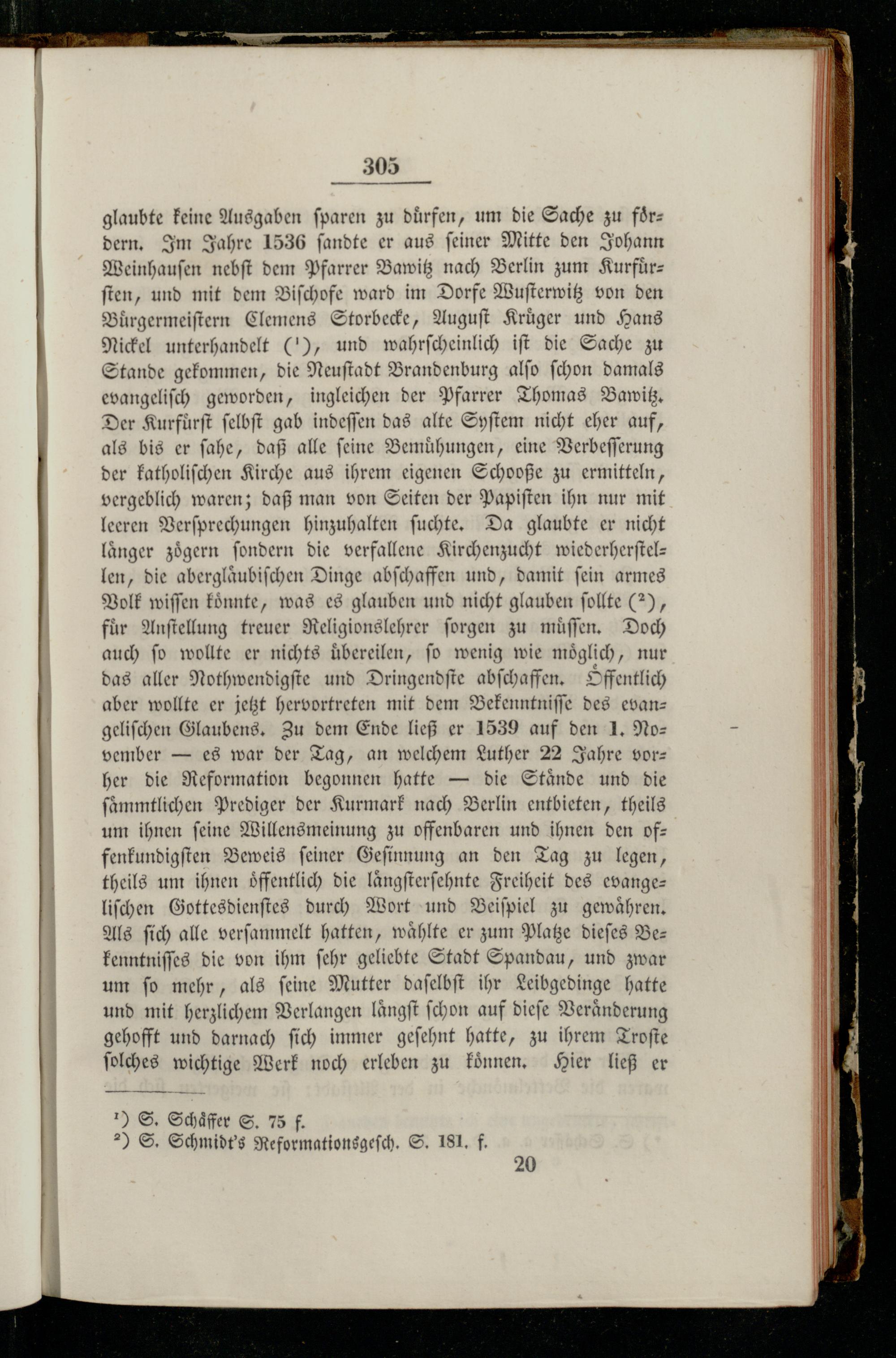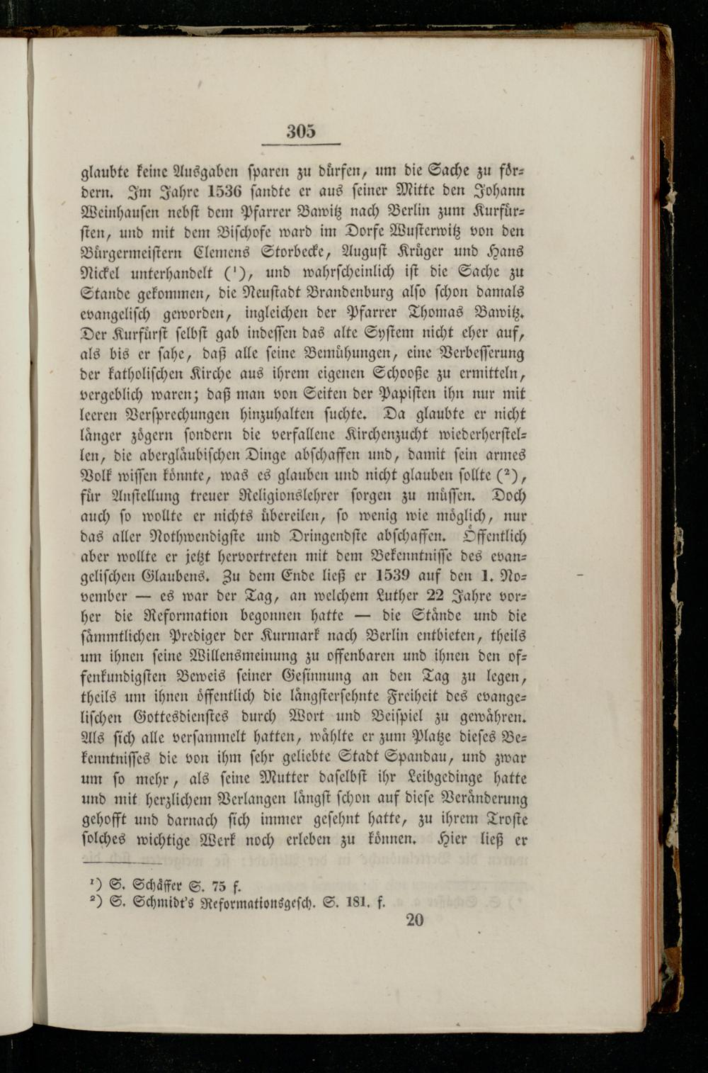 305 glaubte keine Ausgaben ſparen zu dürfen, um die Sache zu foͤrdern. Im Jahre 1536 ſandte er aus ſeiner Mitte den Johann Weinhauſen nebſt dem Pfarrer Bawitz nach Berlin zum Kurfürz ſten, und mit dem Biſchofe ward im Dorfe Wuſterwitz von den Buͤrgermeiſtern Clemens Storbecke, Auguſt Kruͤger und Hans Nickel unterhandelt(), und wahrſcheinlich iſt die Sache zu Stande gekommen, die Neuſtadt Brandenburg alſo ſchon damals evangeliſch geworden, ingleichen der Pfarrer Thomas Bawitz. Der Kurfuͤrſt ſelbſt gab indeſſen das alte Syſtem nicht eher auf, als bis er ſahe, daß alle feine Bemuhungen, eine Verbeſſerung der katholiſchen Kirche aus ihrem eigenen Schooße zu ermitteln, vergeblich waren; daß man von Seiten der Papiſten ihn nur mit leeren Verſprechungen hinzuhalten ſuchte. Da glaubte er nicht länger zögern ſondern die verfallene Kirchenzucht wiederherſtel— len, die aberglaͤubiſchen Dinge abſchaffen und, damit ſein armes Volk wiſſen koͤnnte, was es glauben und nicht glauben ſollte(2), für Anſtellung treuer Religionslehrer ſorgen zu muͤſſen. Doch auch ſo wollte er nichts uͤbereilen, ſo wenig wie moͤglich, nur das aller Nothwendigſte und Dringendſte abſchaffen. Offentlich aber wollte er jetzt hervortreten mit dem Bekenntniſſe des evan— geliſchen Glaubens. Zu dem Ende ließ er 1539 auf den 1. No— vember— es war der Tag, an welchem Luther 22 Jahre vor— her die Reformation begonnen hatte— die Staͤnde und die ſaͤmmtlichen Prediger der Kurmark nach Berlin entbieten, theils um ihnen ſeine Willensmeinung zu offenbaren und ihnen den of— fenkundigſten Beweis ſeiner Geſinnung an den Tag zu legen, theils um ihnen oͤffentlich die laͤngſterſehnte Freiheit des evange— liſchen Gottesdienſtes durch Wort und Beiſpiel zu gewaͤhren. Als ſich alle verſammelt hatten, wählte er zum Platze dieſes Bez kenntniſſes die von ihm ſehr geliebte Stadt Spandau, und zwar um ſo mehr, als ſeine Mutter daſelbſt ihr Leibgedinge hatte und mit herzlichem Verlangen laͤngſt ſchon auf dieſe Veränderung gehofft und darnach ſich immer geſehnt hatte, zu ihrem Troſte ſolches wichtige Werk noch erleben zu koͤnnen. Hier ließ er ) S. Schäffer S. 75 f. ) S. Schmidt's Reformationsgeſch. S. 181. f. 20
