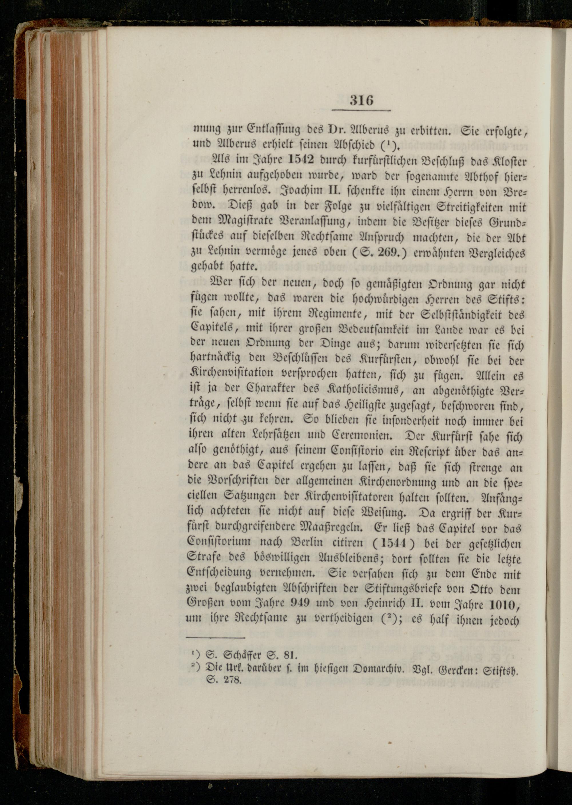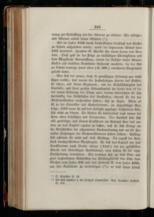 Wer ſich der neuen, doch ſo gemaͤßigten Ordnung gar nicht fuͤgen wollte, das waren die hochwuͤrdigen Herren des Stifts: ſie ſahen, mit ihrem Regimente, mit der Selbſtſtaͤndigkeit des Capitels, mit ihrer großen Bedeutſamkeit im Lande war es bei der neuen Ordnung der Dinge aus; darum widerſetzten ſie ſich hartnaͤckig den Beſchluͤſſen des Kurfuͤrſten, obwohl ſie bei der Kirchenviſitation verſprochen hatten, ſich zu fuͤgen. Allein es iſt ja der Charakter des Katholicismus, an abgenoͤthigte Verträge, ſelbſt wenn fie auf das Heiligſte zugeſagt, beſchworen ſind, ſich nicht zu kehren. So blieben ſie inſonderheit noch immer bei ihren alten Lehrſaͤtzen und Ceremonien. Der Kurfuͤrſt ſahe ſich alſo genoͤthigt, aus feinem Conſiſtorio ein Reſcript über das andere an das Capitel ergehen zu laſſen, daß ſie ſich ſtrenge an die Vorſchriften der allgemeinen Kirchenordnung und an die ſpe— ciellen Satzungen der Kirchenviſitatoren halten ſollten. Anfaͤnglich achteten ſie nicht auf dieſe Weiſung. Da ergriff der Kurz fuͤrſt durchgreifendere Maaßregeln. Er ließ das Capitel vor das Conſiſtorium nach Berlin citiren(1544) bei der geſetzlichen Strafe des boͤswilligen Ausbleibens; dort ſollten fie die letzte Entſcheidung vernehmen. Sie verſahen ſich zu dem Ende mit zwei beglaubigten Abſchriften der Stiftungsbriefe von Otto dem Großen vom Jahre 949 und von Heinrich II. vom Jahre 1010, um ihre Rechtſame zu vertheidigen(2); es half ihnen jedoch
