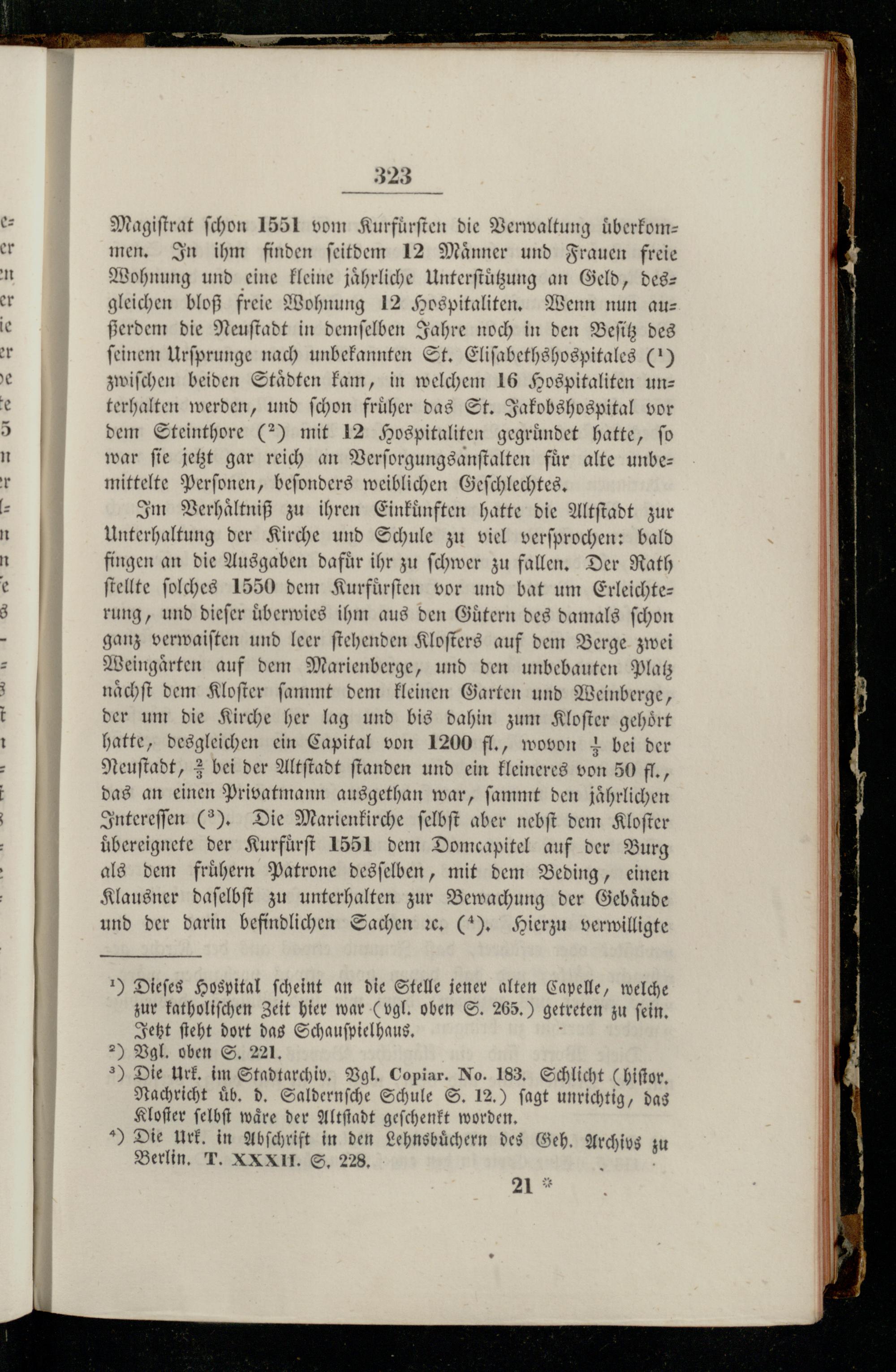 Im Verhaͤltniß zu ihren Einkuͤnften hatte die Altſtadt zur Unterhaltung der Kirche und Schule zu viel verſprochen: bald fingen an die Ausgaben dafuͤr ihr zu ſchwer zu fallen. Der Rath ſtellte ſolches 1550 dem Kurfuͤrſten vor und bat um Erleichte— rung, und dieſer uͤberwies ihm aus den Gütern des damals ſchon ganz verwaiſten und leer ſtehenden Kloſters auf dem Berge zwei Weingaͤrten auf dem Marienberge, und den unbebauten Platz naͤchſt dem Kloſter ſammt dem kleinen Garten und Weinberge, der um die Kirche her lag und bis dahin zum Kloſter gehoͤrt hatte, desgleichen ein Capital von 1200 fl., wovon 3 bei der Neuſtadt, 2 bei der Altſtadt fanden und ein kleineres von 50 fl., das an einen Privatmann ausgethan war, ſammt den jährlichen Intereſſen(3). Die Marienkirche ſelbſt aber nebſt dem Kloſter uͤbereignete der Kurfuͤrſt 1551 dem Domcapitel auf der Burg als dem fruͤhern Patrone desſelben, mit dem Beding, einen Klausner daſelbſt zu unterhalten zur Bewachung der Gebaͤude und der darin befindlichen Sachen 20,(I). Hierzu verwilligte