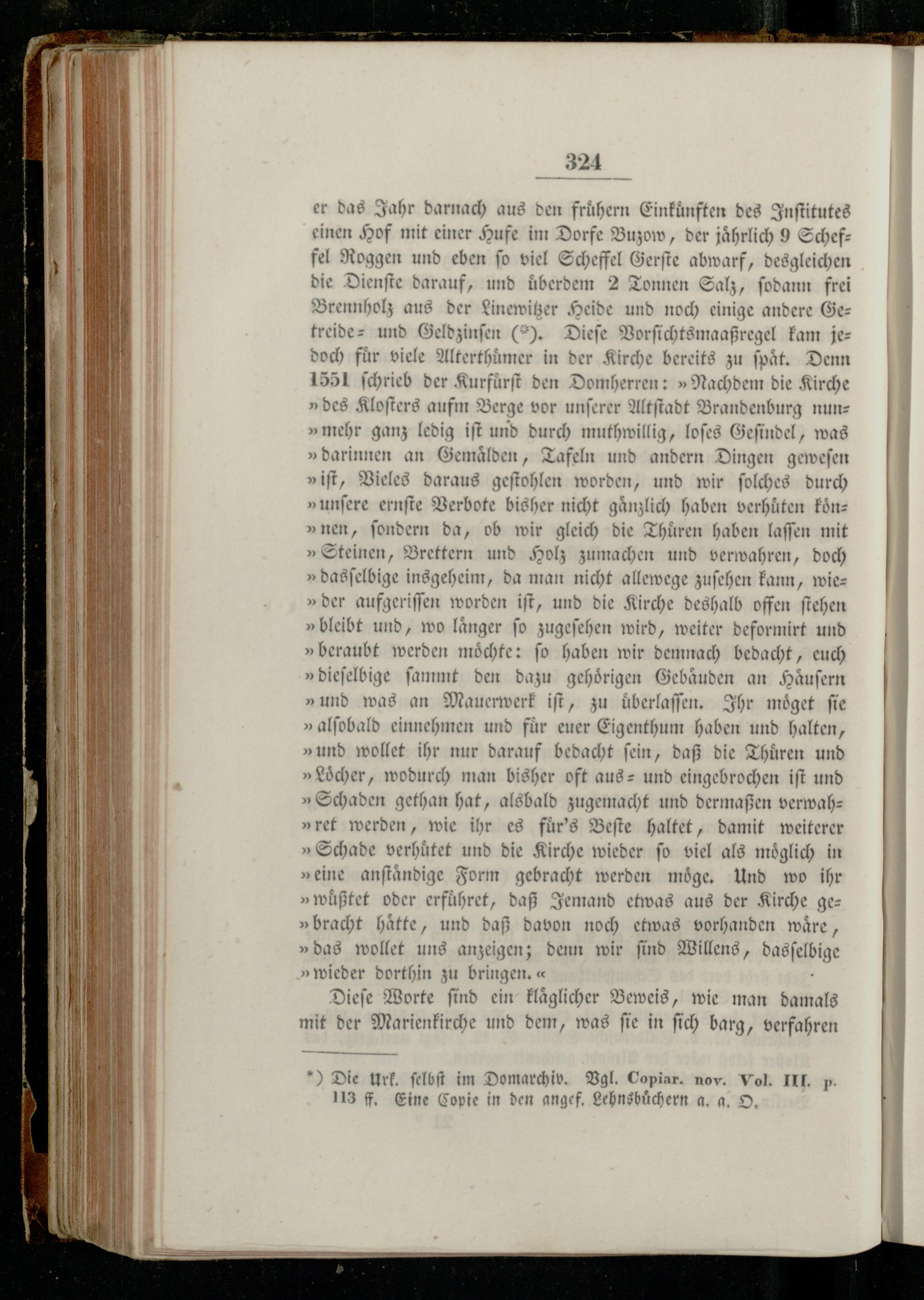 er das Jahr darnach aus den fruͤhern Einkuͤnften des Inſtitutes einen Hof mit einer Hufe im Dorfe Buzow, der jährlich 9 Schef— fel Roggen und eben ſo viel Scheffel Gerſte abwarf, desgleichen die Dienſte darauf, und uͤberdem 2 Tonnen Salz, ſodann frei Brennholz aus der Linewitzer Heide und noch einige andere Getreide⸗ und Geldzinſen(). Dieſe Vorſichtsmaaßregel kam jedoch für viele Alterthuͤmer in der Kirche bereits zu ſpaͤt. Denn 1551 ſchrieb der Kurfuͤrſt den Domherren:» Nachdem die Kirche »des Kloſters aufm Berge vor unſerer Altſtadt Brandenburg nun— »mehr ganz ledig iſt und durch muthwillig, loſes Geſindel, was »darinnen an Gemaͤlden, Tafeln und andern Dingen geweſen »iſt, Vieles daraus geſtohlen worden, und wir ſolches durch »unſere ernſte Verbote bisher nicht gänzlich haben verhuͤten koͤn— »nen, ſondern da, ob wir gleich die Thuͤren haben laſſen mit »Steinen, Brettern und Holz zumachen und verwahren, doch »dasſelbige insgeheim, da man nicht allewege zuſehen kann, wie»der aufgeriſſen worden iſt, und die Kirche deshalb offen ſtehen »bleibt und, wo laͤnger ſo zugeſehen wird, weiter deformirt und » beraubt werden— ſo haben wir demnach bedacht, euch »dieſelbige ſammt den dazu gehoͤrigen Gebaͤuden an Haͤuſern »und was an Mauerwerk iſt, zu uͤberlaſſen. Ihr moͤget fie »alſobald einnehmen und für euer Eigenthum haben und halten, »und wollet ihr nur darauf bedacht ſein, daß die Thuͤren und » Löcher, wodurch man bisher oft aus- und eingebrochen iſt und »Schaden gethan hat, alsbald zugemacht und dermaßen verwah— »ret werden, wie ihr es fürs Beſte haltet, damit weiterer »Schade verhuͤtet und die Kirche wieder ſo viel als moͤglich „eine anſtaͤndige Form gebracht werden möge, Und wo ihr »wuͤßtet oder erfuͤhret, daß Jemand etwas aus der Kirche ge— »bracht haͤtte, und daß davon noch etwas vorhanden waͤre, »das wollet uns anzeigen; denn wir ſind Willens, dasſelbige » wieder dorthin zu bringen,«; Dieſe Worte find ein klaͤglicher Beweis, wie man damals mit der Marienkirche und dem, was ſie in ſich barg, verfahren