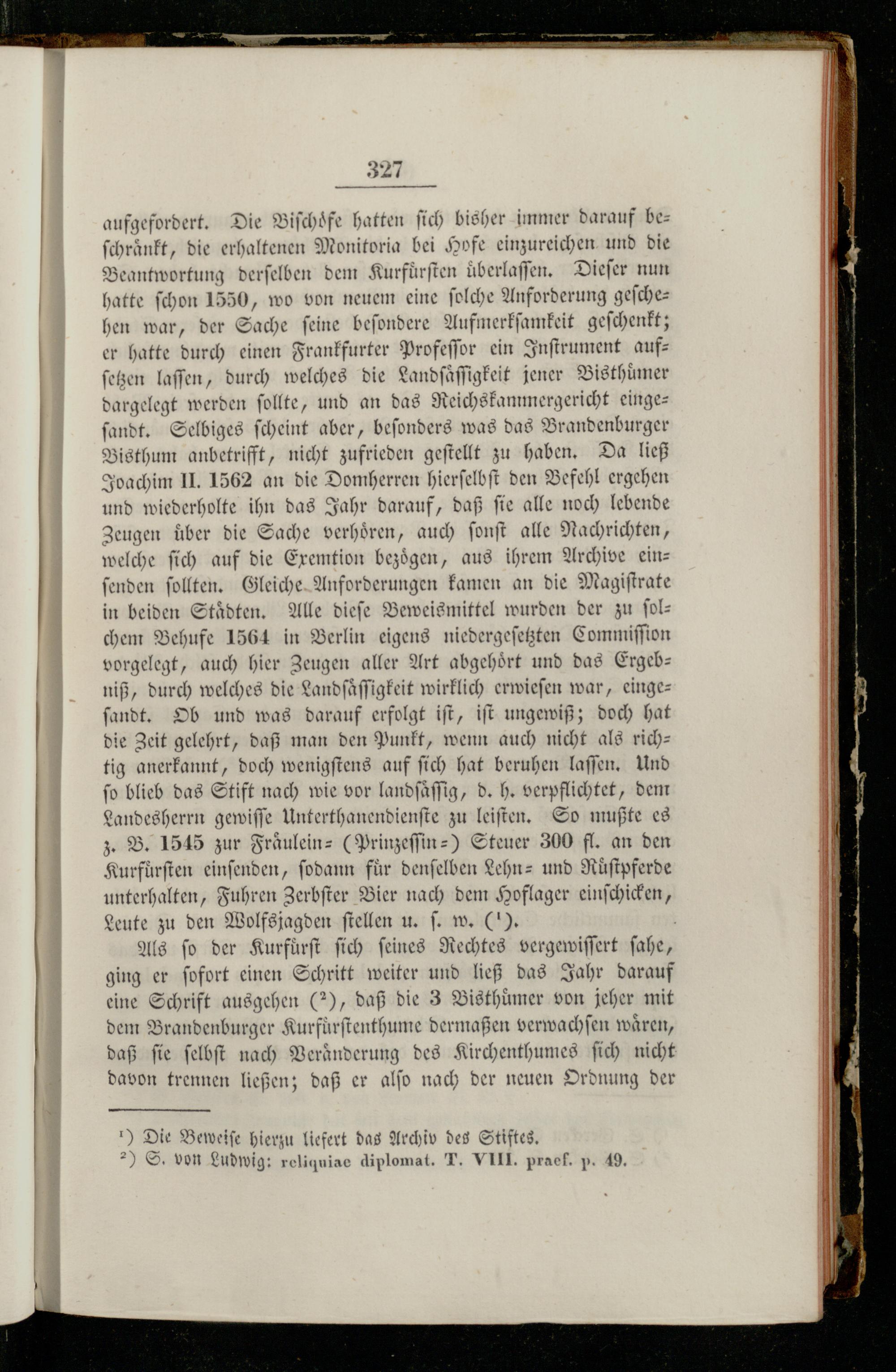 aufgefordert. Die Biſchoͤfe hatten ſich bisher immer darauf beſchrnkt, die erhaltenen Monitoria bei Hofe einzureichen und die Beantwortung derſelben dem Kurfuͤrſten üͤberlaſſen. Dieſer nun hatte ſchon 1550, wo von neuem eine ſolche Anforderung geſchehen war, der Sache ſeine beſondere Aufmerkſamkeit geſchenkt; er hatte durch einen Frankfurter Profeſſor ein Inſtrument aufſetzen laſſen, durch welches die Landſaͤſſigkeit jener Bisthüͤmer dargelegt werden ſollte, und an das Reichskammergericht einge: ſandt. Selbiges ſcheint aber, beſonders was das Brandenburger Bisthum anbetrifft, nicht zufrieden geſtellt zu haben. Da ließ Joachim II. 1562 an die Domherren hierſelbſt den Befehl ergehen und wiederholte ihn das Jahr darauf, daß ſie alle noch lebende Zeugen uͤber die Sache verhoͤren, auch ſonſt alle Nachrichten, welche ſich auf die Exemtion bezoͤgen, aus ihrem Archive ein— ſenden ſollten. Gleiche Anforderungen kamen an die Magiſtrate in beiden Staͤdten. Alle dieſe Beweismittel wurden der zu ſol— chem Behufe 1564 in Berlin eigens niedergeſetzten Commiſſion vorgelegt, auch hier Zeugen aller Art abgehoͤrt und das Ergeb— niß, durch welches die Landſaͤſſigkeit wirklich erwieſen war, einge— ſandt. Ob und was darauf erfolgt iſt, iſt ungewiß; doch hat die Zeit gelehrt, daß man den Punkt, wenn auch nicht als rich— tig anerkannt, doch wenigſtens auf ſich hat beruhen laſſen. Und ſo blieb das Stift nach wie vor landſaͤſſig, d. h. verpflichtet, dem Landesherrn gewiſſe Unterthanendienſte zu leiſten. So mußte es z. B. 1515 zur Fraͤulein-(Prinzeſſin⸗) Steuer 300 fl. an den Kurfuͤrſten einſenden, ſodann fuͤr denſelben Lehn- und Ruͤſtpferde unterhalten, Fuhren Zerbſter Bier nach dem Hoflager einſchicken, Leute zu den Wolfsjagden ſtellen u. ſ. w.(I).