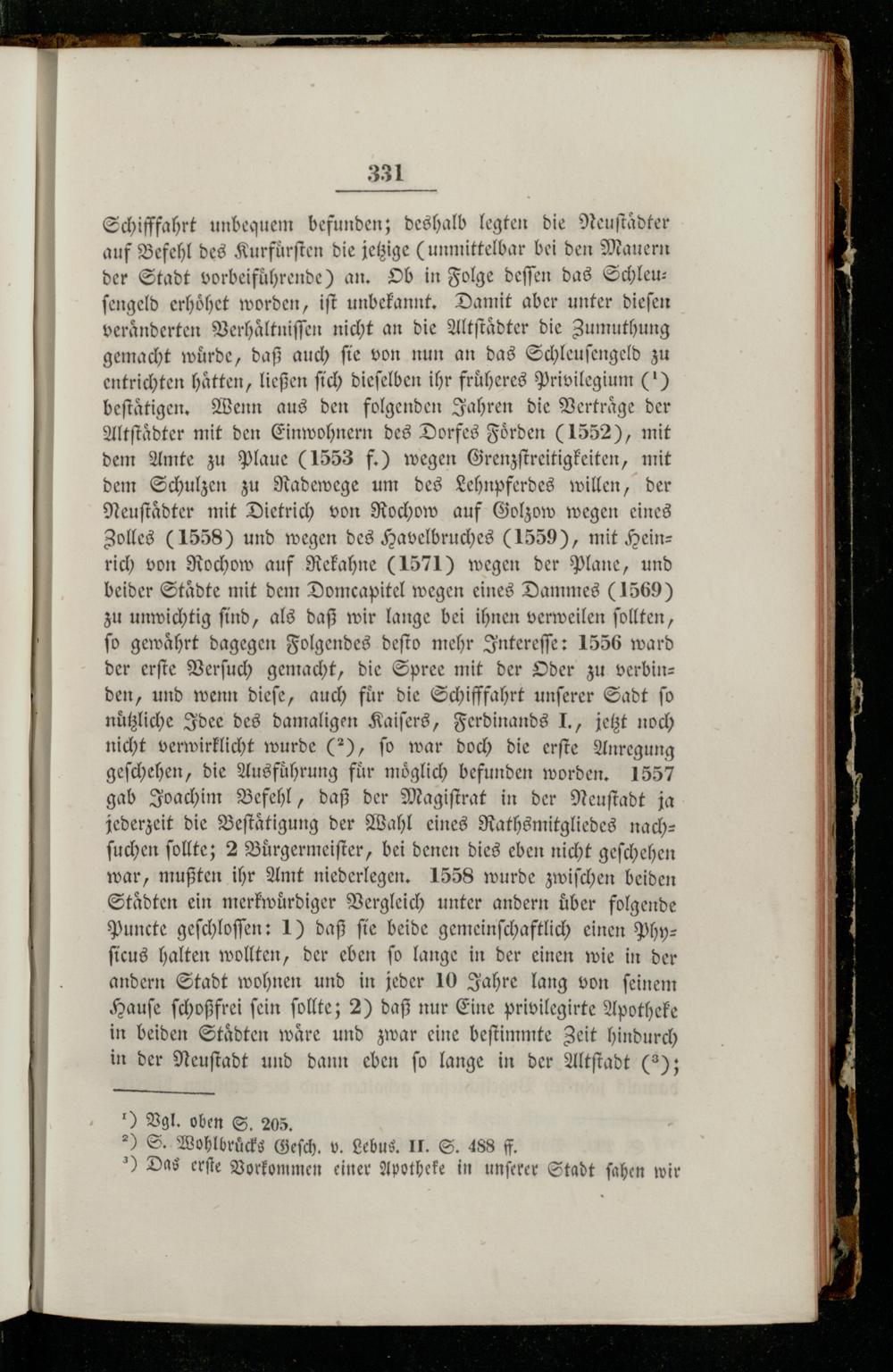 Schifffahrt unbequem befunden; deshalb legten die Neuſtaͤdter auf Befehl des Kurfuͤrſten die jetzige(unmittelbar bei den Mauern der Stadt vorbeifüͤhrende) an. Ob in Folge deſſen das Schleu— ſengeld erhoͤhet worden, iſt unbekannt. Damit aber unter dieſen veraͤnderten Verhaͤltniſſen nicht an die Altſtaͤdter die Zumuthung gemacht wuͤrde, daß auch ſie von nun an das Schleuſengeld zu entrichten haͤtten, ließen ſich dieſelben ihr fruͤheres Privilegium(1) beſtaͤtigen. Wenn aus den folgenden Jahren die Verträge der Altſtaͤdter mit den Einwohnern des Dorfes Foͤrden(1552), mit dem Amte zu Plaue(1553 f.) wegen Grenzſtreitigkeiten, mit dem Schulzen zu Radewege um des Lehnpferdes willen, der Neuſtuͤdter mit Dietrich von Rochow auf Golzow wegen eines Zolles(1558) und wegen des Havelbruches(1559), mit Heinz rich von Rochow auf Rekahne(1571) wegen der Plane, und beider Stuͤdte mit dem Domcapitel wegen eines Dammes(1569) zu unwichtig ſind, als daß wir lange bei ihnen verweilen ſollten, ſo gewaͤhrt dagegen Folgendes deſto mehr Intereſſe: 1556 ward der erſte Verſuch gemacht, die Spree mit der Oder zu verbin— den, und wenn dieſe, auch fuͤr die Schifffahrt unſerer Sadt ſo nuͤtzliche Idee des damaligen Kaiſers, Ferdinands J., jetzt noch nicht verwirklicht wurde(2), fo war doch die erſte Anregung geſchehen, die Ausfuͤhrung fuͤr moͤglich befunden worden. 1557 gab Joachim Befehl, daß der Magiſtrat in der Neuſtadt ja jederzeit die Beſtaͤtigung der Wahl eines Rathsmitgliedes nach— ſuchen follte; 2 Buͤrgermeiſter, bei denen dies eben nicht geſchehen war, mußten ihr Amt niederlegen. 1558 wurde zwiſchen beiden Städten ein merkwuͤrdiger Vergleich unter andern über folgende Puncte geſchloſſen: 1) daß fie beide gemeinſchaftlich einen Phyſicus halten wollten, der eben ſo lange in der einen wie in der andern Stadt wohnen und in jeder 10 Jahre lang von ſeinem Haufe ſchoßfrei fein ſollte; 2) daß nur Eine privilegirte Apotheke in beiden Staͤdten waͤre und zwar eine beſtimmte Zeit hindurch in der Neuſtadt und dann eben fo lange in der Altſtadt(2);