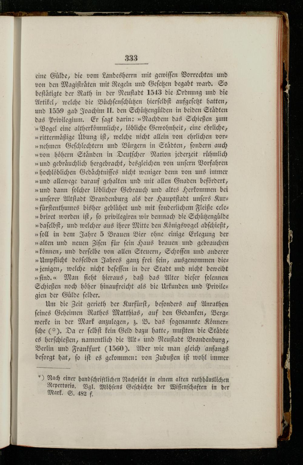 Um die Zeit gerieth der Kurfuͤrſt, beſonders auf Anrathen feines Geheimen Rathes Matthias, auf den Gedanken, Berg— werke in der Mark anzulegen, z. B. das ſogenannte Koͤnnerſche(*). Da er ſelbſt kein Geld dazu hatte, mußten die Staͤdte es herſchießen, namentlich die Alt- und Neuſtadt Brandenburg, Berlin und Frankfurt(1560). Aber wie man gleich anfangs beſorgt hat, ſo iſt es gekommen: von Zubußen iſt wohl immer