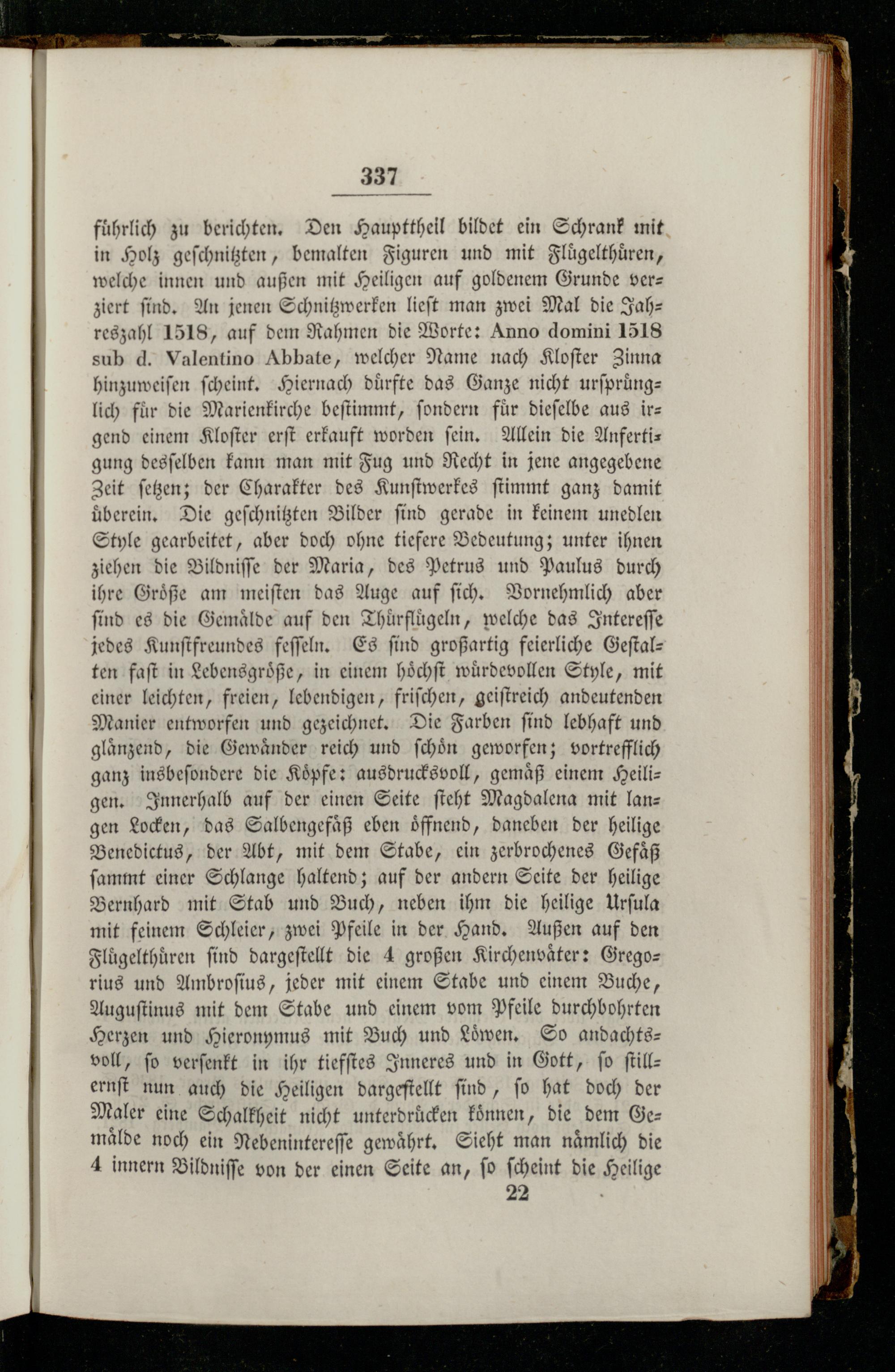 337 fuͤhrlich zu berichten. Den Haupttheil bildet ein Schrank mit in Holz geſchnitzten, bemalten Figuren und mit Fluͤgelthuͤren, welche innen und außen mit Heiligen auf goldenem Grunde ver— ziert ſind. An jenen Schnitzwerken lieſt man zwei Mal die Jah— reszahl 1518, auf dem Rahmen die Worte: Anno domini 1518 sub d. Valentino Abbate, welcher Name nach Kloſter Zinna hinzuweiſen ſcheint. Hiernach dürfte das Ganze nicht urſpruͤng— lich für die Marienkirche beſtimmt, ſondern für dieſelbe aus irz gend einem Kloſter erſt erkauft worden fein, Allein die Anfertigung desſelben kann man mit Fug und Recht in jene angegebene Zeit ſetzen; der Charakter des Kunſtwerkes ſtimmt ganz damit überein, Die geſchnitzten Bilder find gerade in keinem unedlen Style gearbeitet, aber doch ohne tiefere Bedeutung; unter ihnen ziehen die Bildniſſe der Maria, des Petrus und Paulus durch ihre Groͤße am meiſten das Auge auf ſich. Vornehmlich aber find es die Gemaͤlde auf den Thuͤrfluͤgeln, welche das Intereſſe jedes Kunſtfreundes feſſeln. Es find großartig feierliche Geſtalten faſt in Lebensgroͤße, in einem hoͤchſt wuͤrdevollen Style, mit einer leichten, freien, lebendigen, friſchen, geiſtreich andeutenden Manier entworfen und gezeichnet. Die Farben ſind lebhaft und glaͤnzend, die Gewaͤnder reich und ſchoͤn geworfen; vortrefflich ganz insbeſondere die Kopfe: ausdrucksvoll, gemäß einem Heili— gen. Innerhalb auf der einen Seite ſteht Magdalena mit langen Locken, das Salbengefaͤß eben oͤffnend, daneben der heilige Benedictus, der Abt, mit dem Stabe, ein zerbrochenes Gefaͤß ſammt einer Schlange haltend; auf der andern Seite der heilige Bernhard mit Stab und Buch, neben ihm die heilige Urſula mit feinem Schleier, zwei Pfeile in der Hand. Außen auf den Fluͤgelthuͤren find dargeſtellt die 4 großen Kirchenvaͤter: Grego— rius und Ambroſius, jeder mit einem Stabe und einem Buche, Auguſtinus mit dem Stabe und einem vom Pfeile durchbohrten Herzen und Hieronymus mit Buch und Loͤwen. So andachts— voll, ſo verſenkt in ihr tiefſtes Inneres und in Gott, ſo ſtill— ernſt nun auch die Heiligen dargeſtellt ſind, ſo hat doch der Maler eine Schalkheit nicht unterdrücken koͤnnen, die dem Ge— maͤlde noch ein Nebenintereſſe gewährt, Sieht man nämlich die 4 innern Bildniſſe von der einen Seite an, ſo ſcheint die Heilige 22