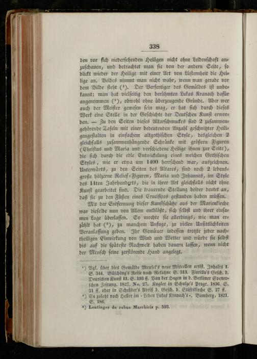 Vgl. über dies Gemälde Meuſel's neue Miscellen artiſt. Inhalts J. S. 314. Buͤſching's Reife nach Rekahne S. 313. Fiorillo's Geſch. d. Deutſchen Kunſt II. S. 193 ff. Von der Hagen in d. Berliner Spenerſchen Zeitung. 1827. No. 27. Kugler in Schulze's Progr. 1836. S. 21 ff, oder in Schroͤder's Abriß d. Geſch. d. Stiftskirche S. 27 ff. So zuletzt noch Heller im» Leben Lukas Kranach's. Bamberg, 1821. S. 186.