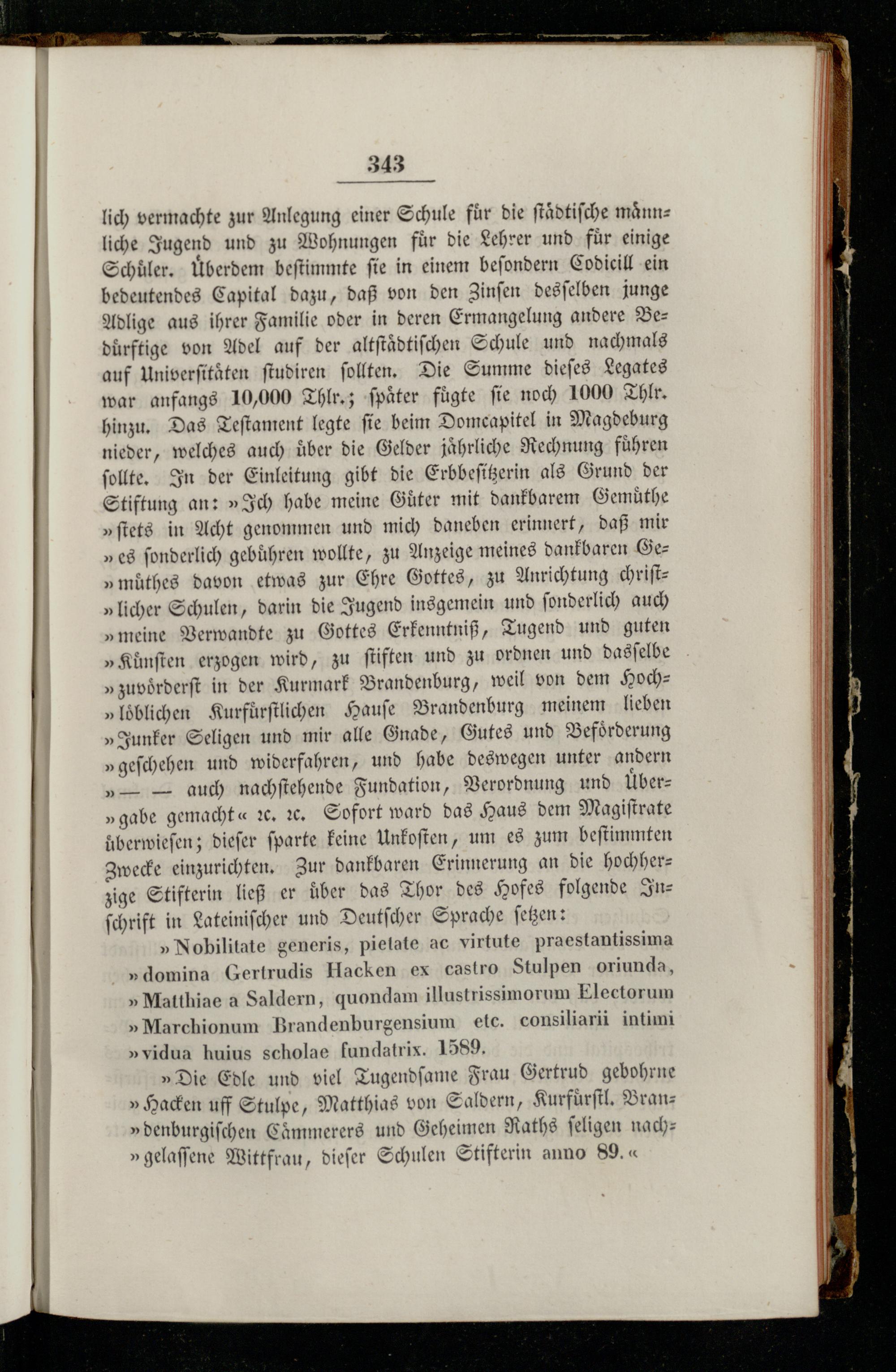 lich vermachte zur Anlegung einer Schule für die ſtaͤdtiſche maͤnnliche Jugend und zu Wohnungen fuͤr die Lehrer und fuͤr einige Schuͤler. uͤberdem beſtimmte ſie in einem beſondern Codicill ein bedeutendes Capital dazu, daß von den Zinſen desſelben junge Adlige aus ihrer Familie oder in deren Ermangelung andere Beduͤrftige von Adel auf der altſtaͤdtiſchen Schule und nachmals auf Univerſitaͤten ſtudiren ſollten. Die Summe dieſes Legates war anfangs 10,000 Thlr.; ſpaͤter fuͤgte ſie noch 1000 Thlr. hinzu. Das Teſtament legte ſie beim Domcapitel in Magdeburg nieder, welches auch über die Gelder jährliche Rechnung fuͤhren ſollte. In der Einleitung gibt die Erbbeſitzerin als Grund der Stiftung an:»Ich habe meine Güter mit dankbarem Semüthe »ſtets in Acht genommen und mich daneben erinnert, daß mir „es ſonderlich gebuͤhren wollte, zu Anzeige meines dankbaren Ge„»muͤthes davon etwas zur Ehre Gottes, zu Anrichtung chriſt„licher Schulen, darin die Jugend insgemein und ſonderlich auch „meine Verwandte zu Gottes Erkenntniß, Tugend und guten „Kuͤnſten erzogen wird, zu ſtiften und zu ordnen und dasſelbe „zuvoͤrderſt in der Kurmark Brandenburg, weil von dem Hochs „loͤblichen Kurfuͤrſtlichen Haufe Brandenburg meinem lieben „Junker Seligen und mir alle Gnade, Gutes und Befoͤrderung »geſchehen und widerfahren, und habe deswegen unter andern „—— auch nachſtehende Fundation, Verordnung und Über: „gabe gemacht« ꝛc. ꝛc. Sofort ward das Haus dem Magiſtrate üͤberwieſen; dieſer ſparte keine Unkoſten, um es zum beſtimmten Zwecke einzurichten. Zur dankbaren Erinnerung an die hochherzige Stifterin ließ er uͤber das Thor des Hofes folgende In— ſchrift in Lateiniſcher und Deutſcher Sprache ſetzen: „Nobilitate generis, pietate ac virtute praestantissima „domina Gertrudis Hacken ex castro Stulpen oriunda, „Matthiae a Saldern, quondam illustrissimorum Electorum » Marchionum Brandenburgensium etc. consiliarii intimi „vidua huius scholae fundatrix. 1589. „Die Edle und viel Tugendſame Frau Gertrud gebohrne » Hacken uff Stulpe, Matthias von Saldern, Kurfuͤrſtl. Bran»denburgiſchen Cammerers und Geheimen Raths ſeligen nach»gelaſſene Wittfrau, dieſer Schulen Stifterin anno 89,«