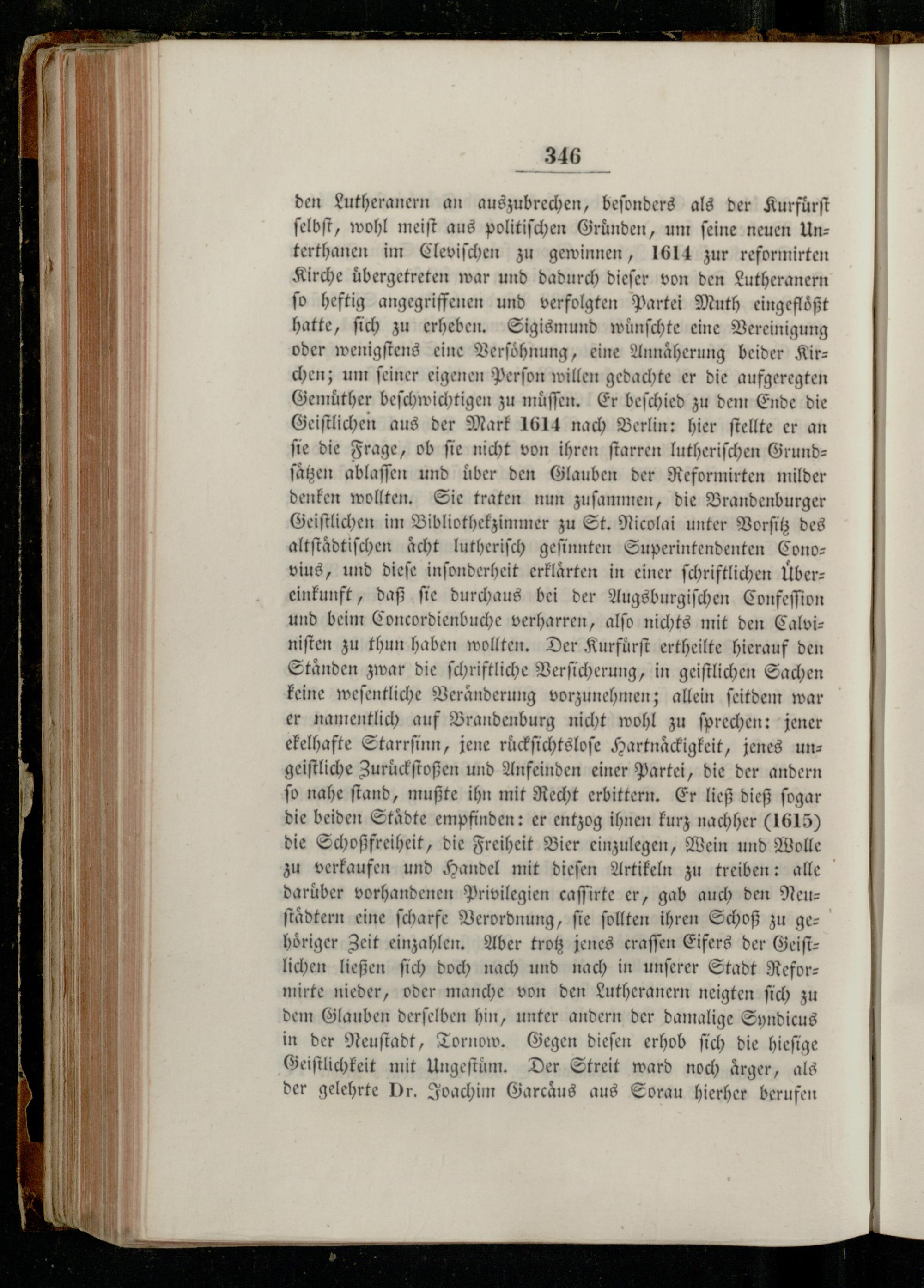 den Lutheranern an auszubrechen, beſonders als der Kurfuͤrſt ſelbſt, wohl meiſt aus politiſchen Gruͤnden, um ſeine neuen Un— terthanen im Cleviſchen zu gewinnen, 1614 zur reformirten Kirche übergetreten war und dadurch dieſer von den Lutheranern fo heftig angegriffenen und verfolgten Partei Muth eingefloͤßt hatte, ſich zu erheben. Sigismund wüuͤnſchte eine Vereinigung oder wenigſtens eine Verſohnung, eine Annaͤherung beider Kirz chen; um ſeiner eigenen Perſon willen gedachte er die aufgeregten Gemuͤther beſchwichtigen zu muͤſſen. Er beſchied zu dem Ende die Geiſtlichen aus der Mark 1614 nach Berlin: hier ſtellte er an ſie die Frage, ob ſie nicht von ihren ſtarren lutheriſchen Grund— ſaͤtzen ablaſſen und über den Glauben der Reformirten milder denken wollten. Sie traten nun zuſammen, die Brandenburger Geiſtlichen im Bibliothekzimmer zu St. Nicolai unter Vorſitz des altſtaͤdtiſchen aͤcht lutheriſch geſinnten Superintendenten Cono—vius, und dieſe inſonderheit erklärten in einer ſchriftlichen uͤber— einkunft, daß ſie durchaus bei der Augsburgiſchen Confeſſion und beim Concordienbuche verharren, alſo nichts mit den Calvi— niſten zu thun haben wollten. Der Kurfürft ertheilte hierauf den Staͤnden zwar die ſchriftliche Verſicherung, in geiſtlichen Sachen keine weſentliche Veraͤnderung vorzunehmen; allein ſeitdem war er namentlich auf Brandenburg nicht wohl zu ſprechen: jener ekelhafte Starrſinn, jene ruͤckſichtsloſe Hartnaͤckigkeit, jenes unz geiſtliche Zuruͤckſtoßen und Anfeinden einer Partei, die der andern ſo nahe ſtand, mußte ihn mit Recht erbittern. Er ließ dieß ſogar die beiden Städte empfinden: er entzog ihnen kurz nachher(1615) die Schoßfreiheit, die Freiheit Bier einzulegen, Wein und Wolle zu verkaufen und Handel mit dieſen Artikeln zu treiben: alle daruber vorhandenen Privilegien caſſirte er, gab auch den Neu— ſtaͤdtern eine ſcharfe Verordnung, fie ſollten ihren Schoß zu ge— hoͤriger Zeit einzahlen. Aber trotz jenes craſſen Eifers der Geiftz lichen ließen ſich doch nach und nach in unſerer Stadt Refor— mirte nieder, oder manche von den Lutheranern neigten ſich zu dem Glauben derſelben hin, unter andern der damalige Syndicus in der Neuſtadt, Tornow. Gegen dieſen erhob ſich die hieſige Geiſtlichkeit mit Ungeſtuͤm. Der Streit ward noch ärger, als der gelehrte Dr. Joachim Garcaͤus aus Sorau hierher berufen