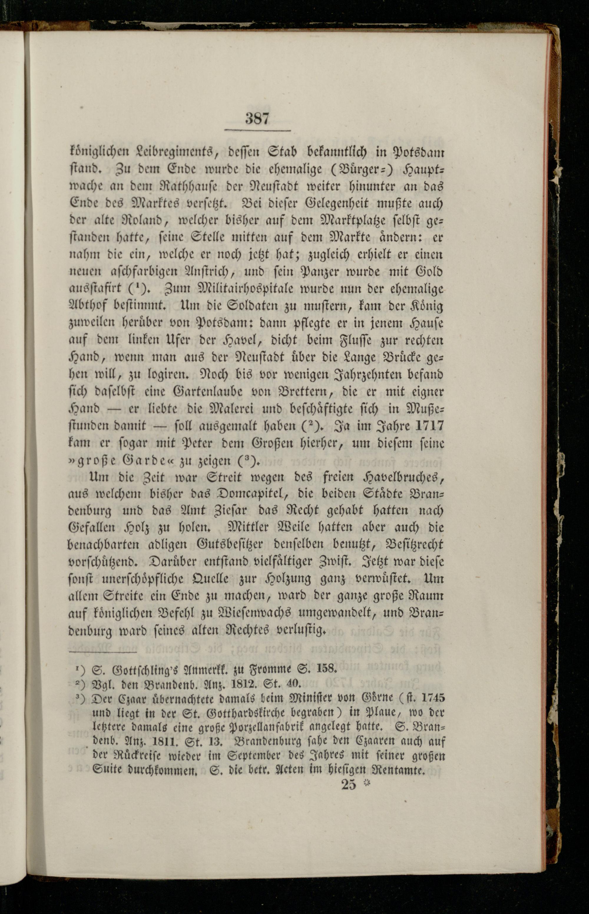 koͤniglichen Leibregiments, deſſen Stab bekanntlich in Potsdam ſtand. Zu dem Ende wurde die ehemalige(Buͤrger-) Hauptwache an dem Rathhauſe der Neuſtadt weiter hinunter an das Ende des Marktes verſetzt. Bei dieſer Gelegenheit mußte auch der alte Roland, welcher bisher auf dem Marktplatze ſelbſt gez ſtanden hatte, ſeine Stelle mitten auf dem Markte aͤndern: er nahm die ein, welche er noch jetzt hat; zugleich erhielt er einen neuen aſchfarbigen Anſtrich, und ſein Panzer wurde mit Gold ausſtafirt(1). Zum Militairhospitale wurde nun der ehemalige Abthof beſtimmt. Um die Soldaten zu muſtern, kam der Koͤnig zuweilen heruͤber von Potsdam: dann pflegte er in jenem Hauſe auf dem linken Ufer der Havel, dicht beim Fluſſe zur rechten Hand, wenn man aus der Neuſtadt uͤber die Lange Brücke gez hen will, zu logiren. Noch bis vor wenigen Jahrzehnten befand ſich daſelbſt eine Gartenlaube von Brettern, die er mit eigner Hand— er liebte die Malerei und beſchaͤftigte ſich in Muße— ſtunden damit— ſoll ausgemalt haben(2). Ja im Jahre 1717 kam er ſogar mit Peter dem Großen hierher, um dieſem ſeine »große Garde« zu zeigen(9).