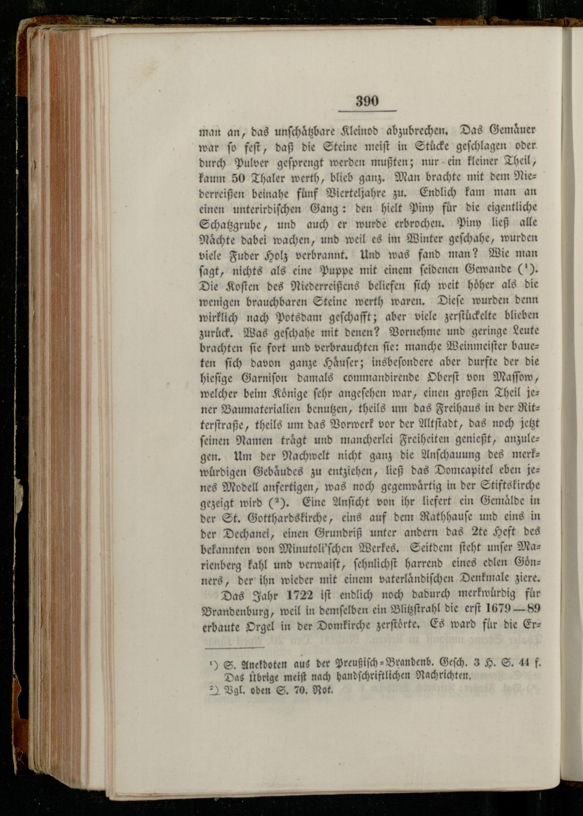 man an, das unſchaͤtzbare Kleinod abzubrechen. Das Gemaͤuer war fo feſt, daß die Steine meiſt in Stuͤcke geſchlagen oder durch Pulver geſprengt werden mußten; nur ein kleiner Theil, kaum 50 Thaler werth, blieb ganz. Man brachte mit dem Niederreißen beinahe fünf Vierteljahre zu. Endlich kam man an einen unterirdiſchen Gang: den hielt Piny für die eigentliche Schatzgrube, und auch er wurde erbrochen. Piny ließ alle Naͤchte dabei wachen, und weil es im Winter geſchahe, wurden viele Fuder Holz verbrannt. Und was fand man? Wie man ſagt, nichts als eine Puppe mit einem ſeidenen Gewande(). Die Koſten des Niederreißens beliefen ſich weit höher als die wenigen brauchbaren Steine werth waren. Dieſe wurden denn wirklich nach Potsdam geſchafft; aber viele zerſtuckelte blieben zurück. Was geſchahe mit denen? Vornehme und geringe Leute brachten fie fort und verbrauchten fie: manche Weinmeiſter baueten ſich davon ganze Haͤuſer; insbeſondere aber durfte der die hieſige Garniſon damals commandirende Oberſt von Maſſow, welcher beim Koͤnige ſehr angeſehen war, einen großen Theil jener Baumaterialien benutzen, theils um das Freihaus in der Ritterſtraße, theils um das Vorwerk vor der Altſtadt, das noch jetzt feinen Namen traͤgt und mancherlei Freiheiten genießt, anzulegen. Um der Nachwelt nicht ganz die Anſchauung des merkwürdigen Gebäudes zu entziehen, ließ das Domcapitel eben jenes Modell anfertigen, was noch gegenwaͤrtig in der Stiftskirche gezeigt wird(2). Eine Anſicht von ihr liefert ein Gemälde in der St. Gotthardskirche, eins auf dem Rathhauſe und eins in der Dechanel, einen Grundriß unter andern das 2Zte Heft des bekannten von Minutoli'ſchen Werkes. Seitdem ſteht unſer Mas rienberg kahl und verwaiſt, ſehnlichſt harrend eines edlen Goͤnners, der ihn wieder mit einem vaterlaͤndiſchen Denkmale ziere.
