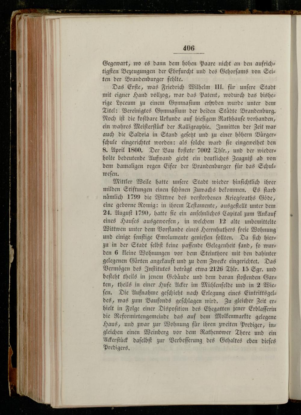 Mittler Weile hatte unſere Stadt wieder hinſichtlich ihrer milden Stiftungen einen ſchoͤnen Zuwachs bekommen. Es ſtarb nämlich 1799 die Wittwe des verſtorbenen Kriegsraths Goͤde, eine geborne Romig: in ihrem Teſtamente, ausgeſtellt unter dem 24. Auguſt 1790, hatte fie ein anſehnliches Capital zum Ankauf eines Hauſes ausgeworfen, in welchem 12 alte unbemittelte Wittwen unter dem Vorſtande eines Herrnhuthers freie Wohnung und einige ſonſtige Emolumente genießen ſollten. Da ſich hier— zu in der Stadt ſelbſt keine paſſende Gelegenheit fand, fo wurden 6 kleine Wohnungen vor dem Steinthore mit den dahinter gelegenen Gaͤrten angekauft und zu dem Zwecke eingerichtet. Das Vermögen des Inſtitutes beträgt etwa 2126 Thlr. 15 Sgr. und beſteht theils in jenem Gebäude und dem daran ſtoßenden Gar— ten, theils in einer Hufe Acker im Muͤhlenfelde und in 2 Wie: fen. Die Aufnahme geſchieht nach Erlegung eines Eintrittsgeldes, was zum Baufonds geſchlagen wird. Zu gleicher Zeit er— hielt in Folge einer Dispoſition des Ehegatten jener Erblaſſerin die Reformirtengemeinde das auf dem Molkenmarkte gelegene Haus, und zwar zur Wohnung für ihren zweiten Prediger, in— gleichen einen Weinberg vor dem Rathenower Thore und ein Ackerſtuck daſelbſt zur Verbeſſerung des Gehaltes eben dieſes Predigers.