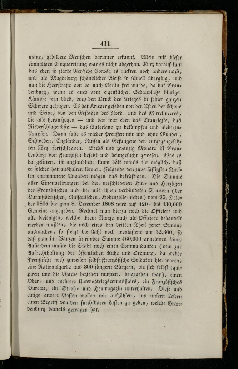 mane, gebildete Menſchen darunter erkannt. Allein mit dieſer einmaligen Einquartirung war es nicht abgethan. Kurz darauf kam das eben ſo ſtarke Ney'ſche Corps; es ruͤckten noch andere nach, und als Magdeburg ſchaͤndlicher Weiſe ſo ſchnell uͤberging, und nun die Heerſtraße von da nach Berlin frei wurde, da hat Bran— denburg, wenn es auch vom eigentlichen Schauplatze blutiger Kämpfe fern blieb, doch den Druck des Krieges in feiner ganzen Schwere getragen. Es hat Krieger geſehen von den Ufern der Rhone und Seine, von den Geſtaden des Nord- und des Mittelmeeres, die alle heraufzogen— und das war eben das Traurigſte, das Niederſchlagendſte— das Vaterland zu bekaͤmpfen und niederzu— kaͤmpfen. Dann ſahe es wieder Preußen mit und ohne Wunden, Schweden, Engländer, Ruſſen als Gefangene den entgegengeſetzten Weg fortſchleppen. Sechs und zwanzig Monate iſt Bran— denburg von Franzoſen beſetzt und heimgeſucht geweſen. Was es da gelitten, if unglaublich: kaum hält man's für möglich, daß es ſolches hat aushalten koͤnnen. Folgende den zuverlaͤſſigſten Quellen entnommene Angaben mögen das bekraͤftigen. Die Summe aller Einquartirungen bei den verſchiedenen Hin- und Herzuͤgen der Franzoͤſiſchen und der mit ihnen verbuͤndeten Truppen(der Darmſtaͤdtiſchen, Naſſauiſchen, Hohenzollernſchen) vom 25. Octo— ber 1806 bis zum 8. December 1808 wird auf 420= bis 430,000 Gemeine angegeben. Rechnet man hierzu noch die Officiere und alle diejenigen, welche ihrem Range nach als Officiere behandelt werden mußten, die noch etwa den dritten Theil jener Summe ausmachen, ſo ſteigt die Zahl noch wenigſtens um 32,300, ſo daß man im Ganzen in runder Summe 460,900 annehmen kann. Außerdem mußte die Stadt noch einen Commandanten(dem zur Aufrechthaltung der offentlichen Ruhe und Ordnung, da weder Preußiſche noch zuweilen ſelbſt Franzoͤſiſche Soldaten hier waren, eine Nationalgarde aus 300 juͤngern Bürgern, die ſich ſelbſt equiz piren und die Wache beziehen mußten, beigegeben war), einen Ober- und mehrere Unter-Kriegscommiſſairs, ein Franzoͤſiſches Bureau, ein Stroh- und Heumagazin unterhalten. Dieſe und einige andere Poſten wollen wir aufzaͤhlen, um unſern Leſern einen Begriff von den furchtbaren Laſten zu geben, welche Bran— denburg damals getragen hat.