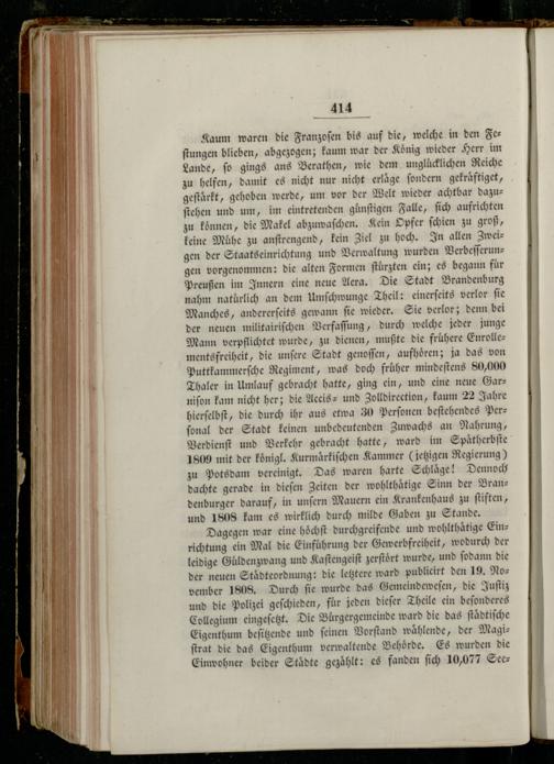 Dagegen war eine höchft durchgreifende und wohlthaͤtige Einrichtung ein Mal die Einführung der Gewerbfreiheit, wodurch der leidige Güldenzwang und Kaſtengeiſt zerſtoͤrt wurde, und ſodann die der neuen Staͤdteordnung: die letztere ward publicirt den 19. November 1808. Durch ſie wurde das Gemeindeweſen, die Juſtiz und die Polizei geſchieden, fuͤr jeden dieſer Theile ein beſonderes Collegium eingeſetzt. Die Burgergemeinde ward die das ſtaͤdtiſche Eigenthum beſitzende und ſeinen Vorſtand waͤhlende, der Magiſtrat die das Eigenthum verwaltende Behoͤrde. Es wurden die Einwohner beider Staͤdte gezuͤhlt: es fanden ſich 10,077 See