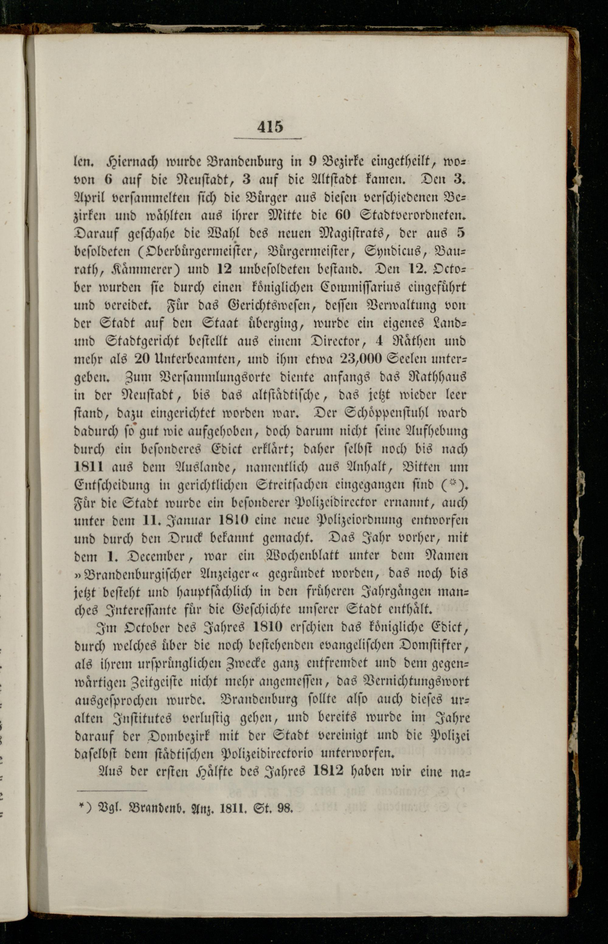 len. Hiernach wurde Brandenburg in 9 Bezirke eingetheilt, wovon 6 auf die Neuſtadt, 3 auf die Altſtadt kamen. Den 3. April verſammelten ſich die Buͤrger aus dieſen verſchiedenen Be— zirken und waͤhlten aus ihrer Mitte die 60 Stadtverordneten. Darauf geſchahe die Wahl des neuen Magiſtrats, der aus 5 beſoldeten(Oberbuͤrgermeiſter, Buͤrgermeiſter, Syndicus, Baurath, Kämmerer) und 12 unbeſoldeten beſtand. Den 12. Octo—ber wurden fie durch einen koͤniglichen Commiſſarius eingeführt und vereidet. Für das Gerichtsweſen, deſſen Verwaltung von der Stadt auf den Staat uͤberging, wurde ein eigenes Land— und Stadtgericht beſtellt aus einem Director, 4 Raͤthen und mehr als 20 Unterbeamten, und ihm etwa 23,000 Seelen unter— geben. Zum Verſammlungsorte diente anfangs das Rathhaus in der Neuſtadt, bis das altſtaͤdtiſche, das jetzt wieder leer ſtand, dazu eingerichtet worden war. Der Schoͤppenſtuhl ward dadurch ſo gut wie aufgehoben, doch darum nicht ſeine Aufhebung durch ein beſonderes Edict erklaͤrt; daher ſelbſt noch bis nach 1811 aus dem Auslande, namentlich aus Anhalt, Bitten um Entſcheidung in gerichtlichen Streitſachen eingegangen ſind(*). Fuͤr die Stadt wurde ein beſonderer Polizeidirector ernannt, auch unter dem 11. Januar 1810 eine neue Polizeiordnung entworfen und durch den Druck bekannt gemacht. Das Jahr vorher, mit dem 1. December, war ein Wochenblatt unter dem Namen »Brandenburgiſcher Anzeiger« gegründet worden, das noch bis jetzt beſteht und hauptſaͤchlich in den fruͤheren Jahrgaͤngen manz ches Intereſſante fuͤr die Geſchichte unſerer Stadt enthaͤlt.