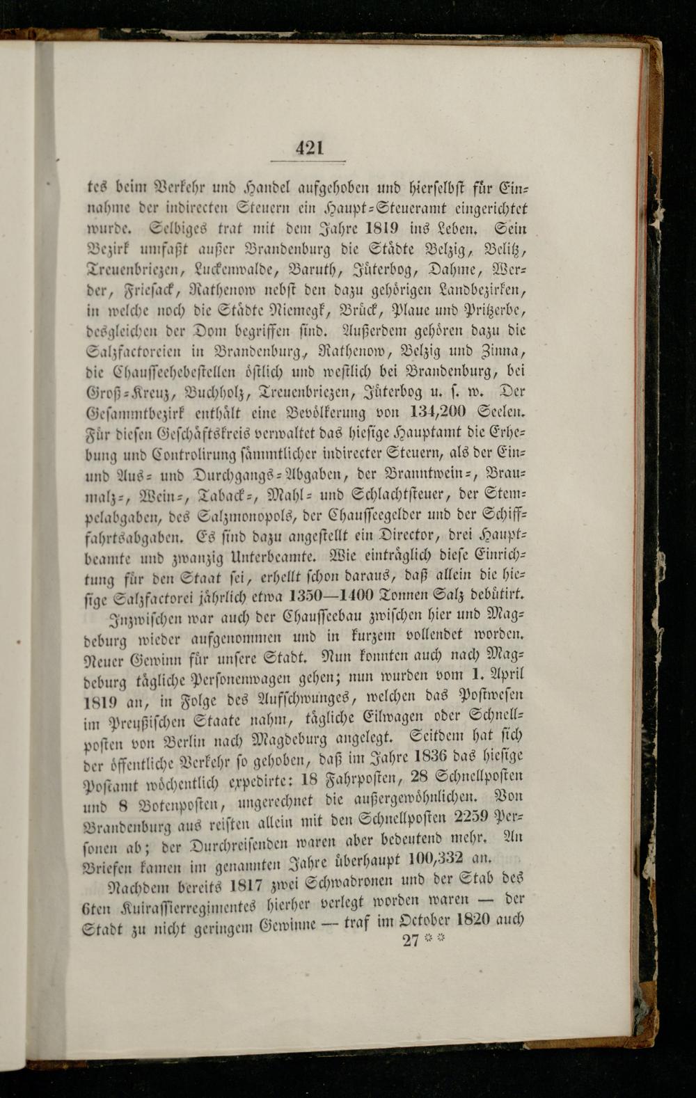 421 tes beim Verkehr und Handel aufgehoben und hierſelbſt für Ein— nahme der indirecten Steuern ein Haupt-Steueramt eingerichtet wurde. Selbiges trat mit dem Jahre 1819 ins Leben. Sein Bezirk umfaßt außer Brandenburg die Staͤdte Belzig, Belitz, Treuenbriezen, Luckenwalde, Baruth, Juͤterbog, Dahme, Wer— der, Frieſack, Rathenow nebſt den dazu gehoͤrigen Landbezirken, in welche noch die Staͤdte Niemegk, Bruͤck, Plaue und Pritzerbe, desgleichen der Dom begriffen ſind. Außerdem gehoͤren dazu die Salzfactoreien in Brandenburg, Rathenow, Belzig und Zinna, die Chauſſeehebeſtellen oͤſtlich und weſtlich bei Brandenburg, bei Groß⸗-Kreuz, Buchholz, Treuenbriezen, Juͤterbog u. ſ. w. Der Geſammtbezirk enthält eine Bevoͤlkerung von 134,200 Seelen. Für dieſen Geſchaͤftskreis verwaltet das hieſige Hauptamt die Erhebung und Controlirung ſaͤmmtlicher indirecter Steuern, als der Einz und Aus- und Durchgangs-Abgaben, der Branntwein-, Braumalz-, Wein-, Taback-, Mahl- und Schlachtſteuer, der Stempelabgaben, des Salzmonopols, der Chauſſeegelder und der Schifffahrtsabgaben. Es find dazu angeſtellt ein Director, drei Hauptbeamte und zwanzig Unterbeamte. Wie eintraͤglich dieſe Einrich— tung für den Staat ſei, erhellt ſchon daraus, daß allein die hieſige Salzfactorei jahrlich etwa 1350 – 1100 Tonnen Salz debuͤtirt. Inzwiſchen war auch der Chauſſeebau zwiſchen hier und Mag—deburg wieder aufgenommen und in kurzem vollendet worden. Neuer Gewinn fuͤr unſere Stadt. Nun konnten auch nach Mag— deburg tagliche Perſonenwagen gehen; nun wurden vom 1. April 1819 an, in Folge des Aufſchwunges, welchen das Poſtweſen im Preußiſchen Staate nahm, taͤgliche Eilwagen oder Schnellpoſten von Berlin nach Magdeburg angelegt. Seitdem hat ſich der oͤffentliche Verkehr ſo gehoben, daß im Jahre 1836 das hieſige Poſtamt woͤchentlich expedirte: 18 Fahrpoſten, 28 Schnellpoſten ungerechnet die außergewoͤhnlichen. Von