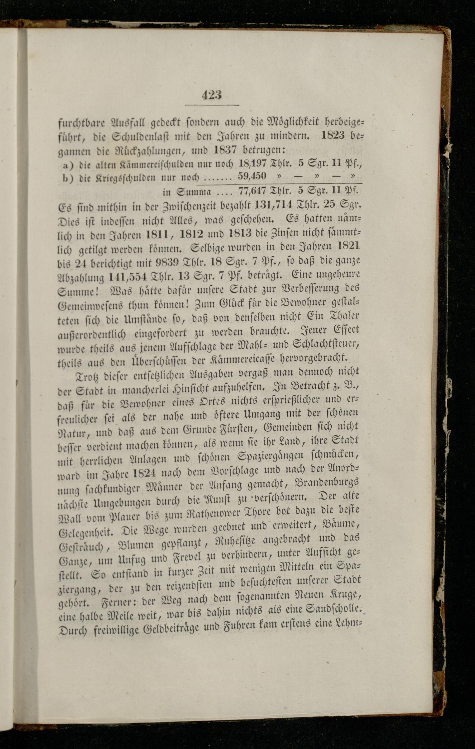 Dies iſt indeſſen nicht Alles, was geſchehen. Es hatten naͤmlich in den Jahren 1811, 1812 und 1813 die Zinſen nicht ſaͤmmtlich getilgt werden koͤnnen. Selbige wurden in den Jahren 1821 bis 24 berichtigt mit 9839 Thlr. 18 Sgr. 7 Pf., ſo daß die ganze Abzahlung 141,551 Thlr. 13 Sgr. 7 Pf. betraͤgt. Eine ungeheure Summe! Was haͤtte dafuͤr unſere Stadt zur Verbeſſerung des Gemeinweſens thun koͤnnen! Zum Gluͤck fuͤr die Bewohner geſtalteten ſich die Umſtaͤnde ſo, daß von denſelben nicht Ein Thaler außerordentlich eingefordert zu werden brauchte. Jener Effect wurde theils aus jenem Aufſchlage der Mahl- und Schlachtſteuer, theils aus den uͤberſchuͤſſen der Kaͤmmereicaſſe hervorgebracht. Trotz dieſer entſetzlichen Ausgaben vergaß man dennoch nicht der Stadt in mancherlei Hinſicht aufzuhelfen. In Betracht z. B. daß für die Bewohner eines Ortes nichts erſprießlicher und erfreulicher ſei als der nahe und oͤftere Umgang mit der ſchoͤnen Natur, und daß aus dem Grunde Fuͤrſten, Gemeinden ſich nicht beſſer verdient machen koͤnnen, als wenn ſie ihr Land, ihre Stadt mit herrlichen Anlagen und ſchoͤnen Spaziergaͤngen ſchmüͤcken, ward im Jahre 1824 nach den Vorſchlage und nach der Anordnung ſachkundiger Maͤnner der Anfang gemacht, Brandenburgs naͤchſte Umgebungen durch die Kunſt zu verſchoͤnern. Der alte Wall vom Plauer bis zum Rathenower Thore bot dazu die beſte Gelegenheit. Die Wege wurden geebnet und erweitert, Baͤume, Geſtraͤuch, Blumen gepflanzt Ruheſitze angebracht und das Ganze, um Unfug und Frevel zu verhindern, unter Aufſicht geſtellt. So entſtand in kurzer Zeit mit wenigen Mitteln ein Spas ziergang, der zu den reizendſten und beſuchteſten unſerer Stadt gehoͤrt. Ferner: der Weg nach dem ſogenannten Neuen Kruge, eine halbe Meile weit, war bis dahin nichts als eine Sandſcholle. Durch freiwillige Geldbeitruͤge und Fuhren kam erſtens eine Lehm