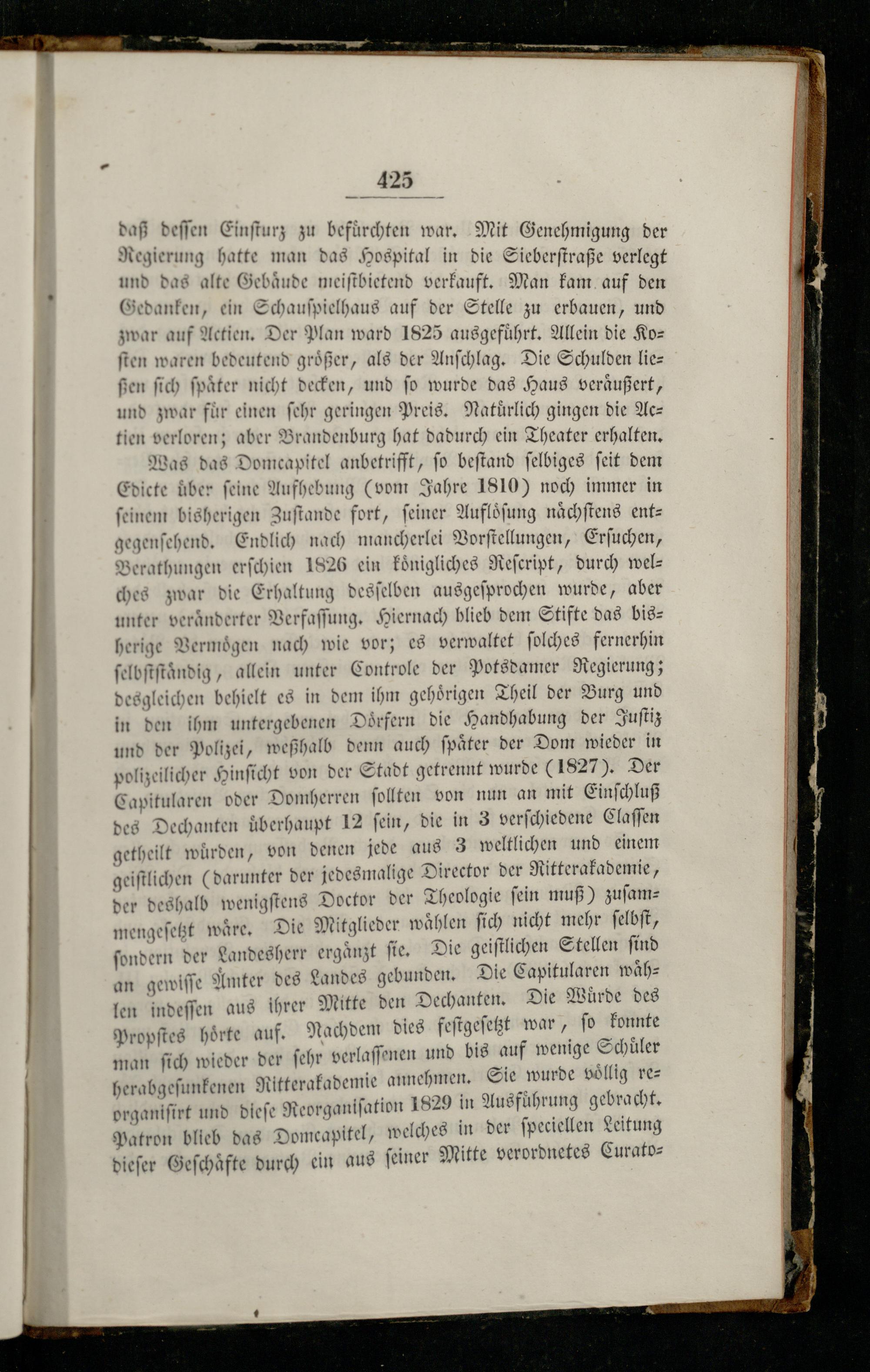 ches zwar unter ver herige— nach wie vor; e ſelbſtſtaͤndig, allein unter Controle der Potsdamer Regierung; desgleichen behielt es in dem ihm irn Theil der Burg und in den ihm untergebenen Dörfern die Handhabung der Juſtiz und der Polizei, weßhalb denn auch ſpaͤter der Dom wieder in polizeilicher Hinſicht von der Stadt getrennt wurde(1827). Der Capitularen oder Domherren ſollten von nun an mit Einſchluß des Dechanten überhaupt 12 fein, die in 3 verſchiedene Claſſen getheilt wuͤrden, von denen jede aus 3 weltlichen und einem geiſtlichen(darunter der jede desmalige Director der Ritterakademie, der deshalb 1 Doctor der Theologie fein muß) zuſam— mengeſetzt wa e Mitglieder wähle en fich nicht mehr felbft, ſondern der 1 ergaͤnzt ſie. e geiſtlichen Stellen find des Landes ge—* Die Capitularen waͤh